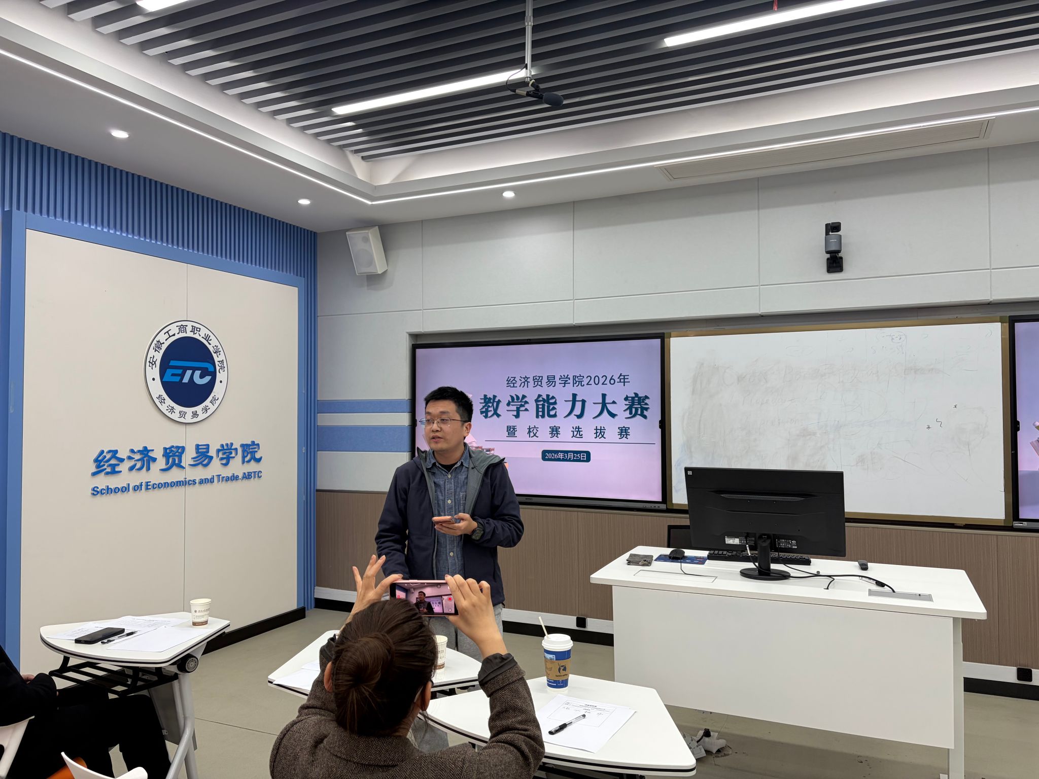 3月25日,经济贸易学院在学院教科研中心举办2026年教学能力大赛暨校赛选拔赛。本次大赛旨在深化教学关键要素改革,提升教师教学水平和育人能力,为校赛遴选优秀团队。全院教职工现场观摩。大赛由经济贸易学院副院长张键主持。大赛特邀张颖、王韦、黄锐、刘兰兰共同参与现场评审。