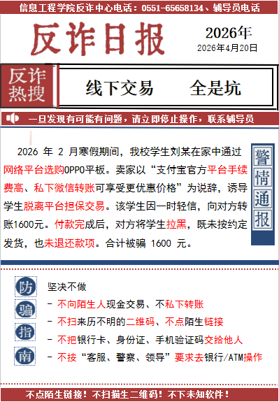 学院坚持以案预警、常态宣教,紧密围绕大学生高发、易受骗的诈骗类型,持续发布专题反诈日报。日报精选校园真实警情案例,深度拆解冒充熟人、刷单返利等典型诈骗作案手法,同步配套简明易懂的防骗口诀、应急处置指引与预警提醒,以短小精炼、直观易懂的形式常态化推送反诈警示。通过常态化风险提示,持续强化学生风险防范意识,时刻绷紧反诈安全之弦,切实筑牢校园反诈安全思想防线。