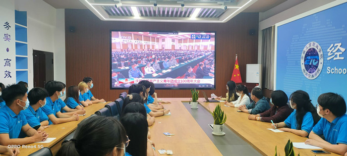 2022年5月10日上午10:00,庆祝中国共产主义青年团100周年大会在北京人民大会堂隆重举行,中共中央总书记、国家主席、中央军委主席习近平发表重要讲话。经济贸易学院党政领导、部分辅导员和学生会骨干、团干、团员代表积极收看大会直播并展开热议。