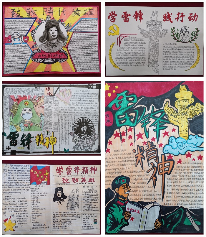 手抄报评选 3月17日,组织开展“传承雷锋精神,争做文明先锋”为主题手抄报比赛。通过组织宣传,同学们踊跃参与,精心设计,将自己对雷锋精神的感悟浓缩在手抄报中,对雷锋事迹、雷锋精神进行全方位宣传学习,把对雷锋的崇敬和怀念之情深深融入到手抄报创作之中,充分颂扬了雷锋全心全意为人民服务的优秀品质。