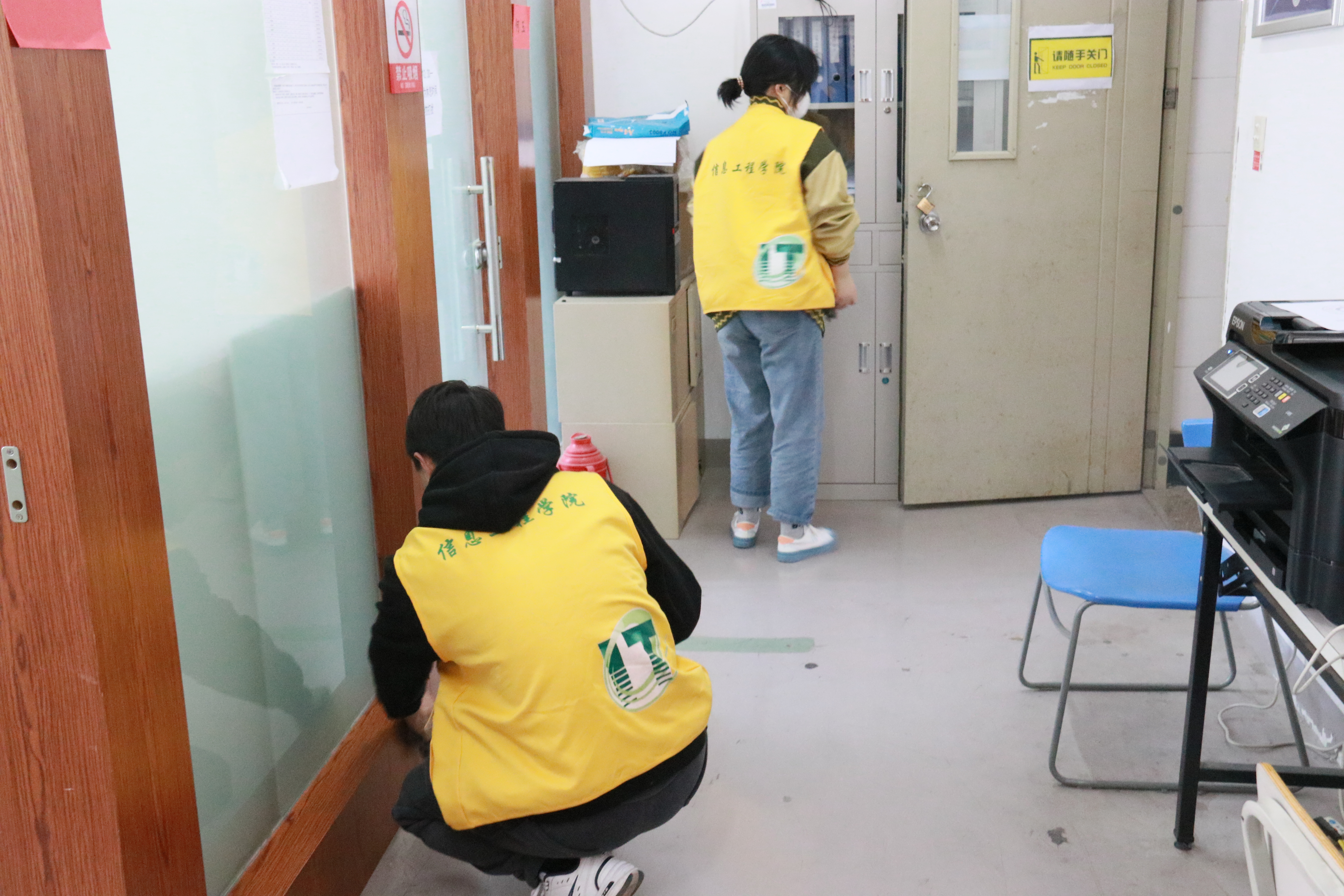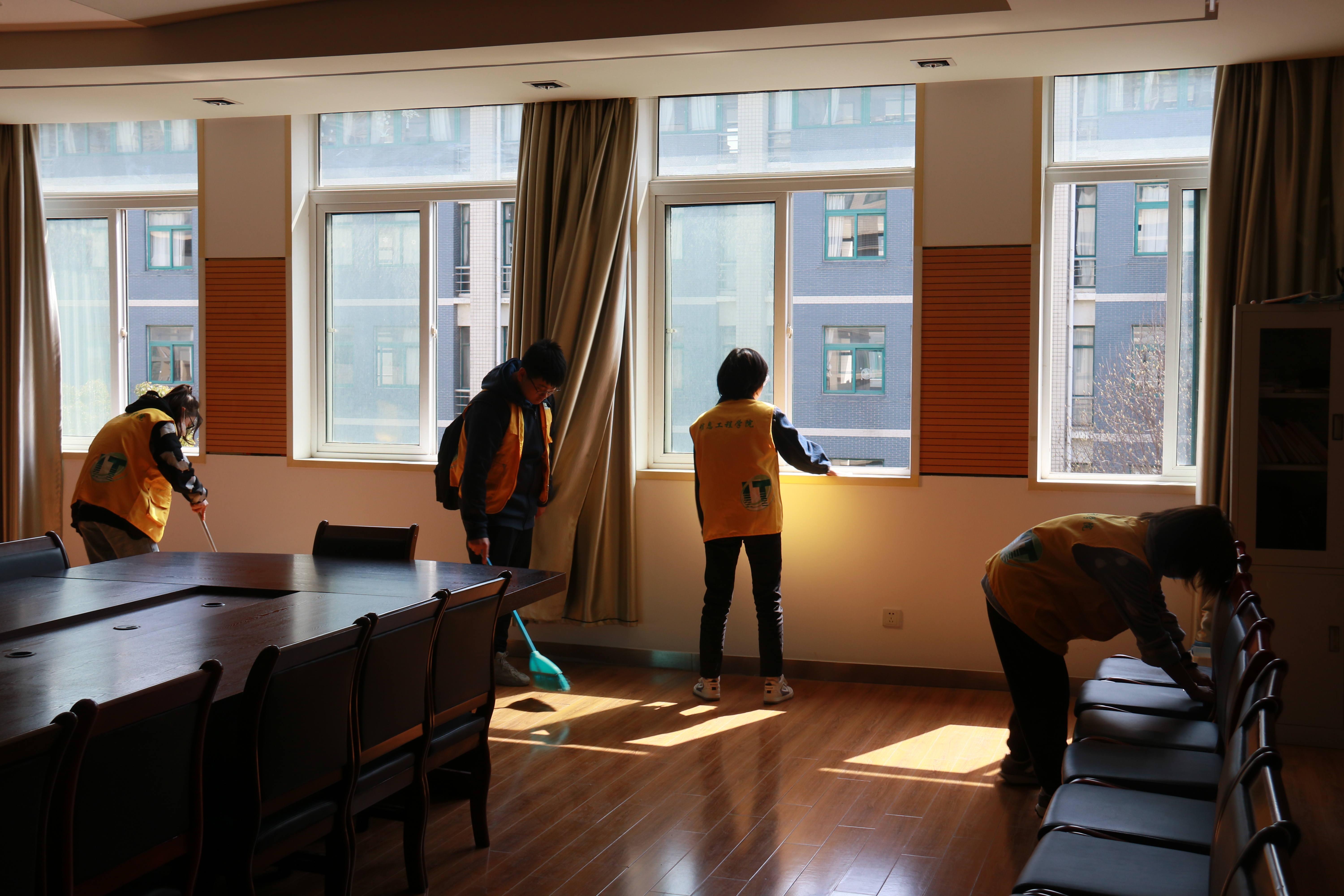 为了贯彻落实习近平总书记系列重要讲话精神,以社会主义核心价值体系建设为根本,以学雷锋精神为魂、以志愿服务为依托,信息工程学院团总支学生会举办了“校园清洁行,有你一定行”的清扫校园雷锋活动,对信息工程学院楼、周边绿化带进行了清洁活动。他们统一着装,整齐有序地进行卫生打扫,或用扫帚清扫地面,或将纸屑垃圾捡拾起来,或用抹布将教室的桌椅和窗户擦得干净锃亮……忙碌的“小黄人”成了信息工程学院楼一道亮丽的风景。