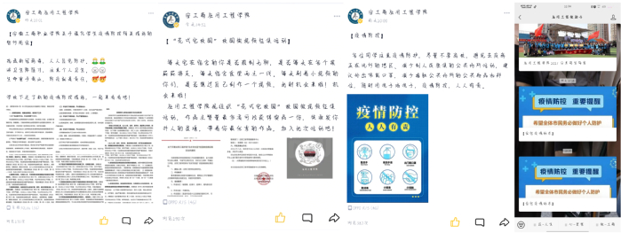 学院积极利用网络新媒体等平台,坚持“学生工作不间断,思想教育不断线”,做好学生日常管理,坚决落实晨午晚检制度,强化学生思想引领,全力维护学校的安全稳定。辅导员们依托微信、QQ等线上平台,全面、及时地向全体学生传达学校的各项规定和要求,做到信息传递地上通下达,做好校情传达工作。学院通过“应用工程学院”公众号、学院抖音号等线上平台推送疫情防控相关内容,传达新的防控要点,督促学生加强个人防护。