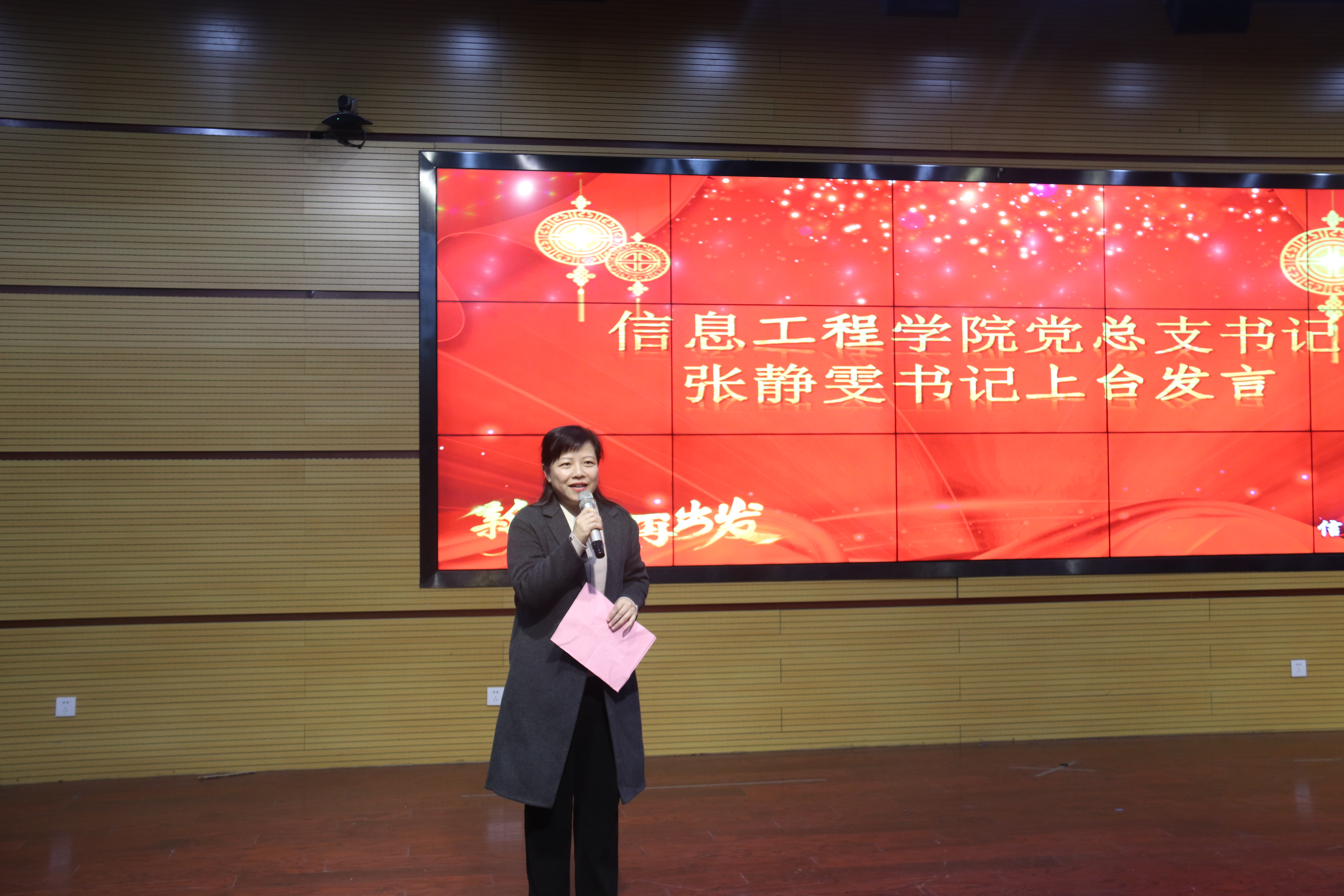 元旦将至,为喜迎新春,展示信息工程学院师生奋发进取的精神风貌,同时也为表彰先锋模范、树立典型,引领和激励同学,营造积极向上的氛围。我院于12月23日晚举行了主题为“青春扬帆,执梦远航” 的2021年度信息工程学院新年晚会暨表彰大会。出席本次活动的有我院党总支书记张静雯、办公室主任黄亮及部分教师和同学。