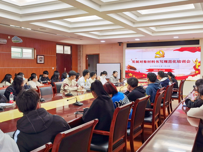 为了贯彻落实《中国共产党章程》《中国共产党发展党员工作细则》等关于党员发展工作的指示精神,严格党员发展程序,确保党员发展质量,同时深入推进党史学习教育,坚定党员发展对象理想信念,进一步规范发展党员工作相关材料。2021年11月19日下午,会计学院学生第一党支部在明德楼二号会议室召开了发展对象材料书写规范化培训会,支部书记余想花主持会议,支部全体发展对象和部分学生预备党员参加了此次会议。