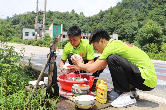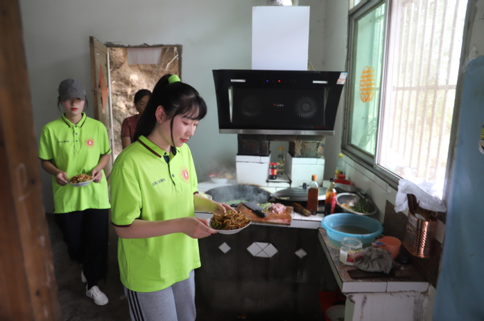一到曾奶奶家,队员们顾不上擦拭脸颊上的汗水,七手八脚地帮着曾奶奶打扫院落、收拾屋子;几名女队员钻进了厨房,蹲在地上开始收拾带来的鸡、鱼和蔬菜等食材;其他几名队员把周边的困难老人也都邀请来,准备中午给老人家们做一顿满满爱意的午餐。队员们和老人们自由交谈的同时,认真倾听老人们讲述着近几年乡村变化的经历。同学们也把自己在外读书情况以及家乡情况给老人们一一讲述。队员们的到来使原本孤寂的院落充满了欢声笑语。屋外烈日炎炎,犹如屋内暖意融融。
