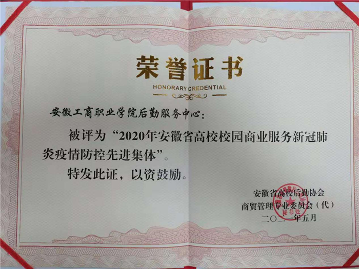近日,在安徽省高校后勤协会商贸管理专业委员会召开的二届三次主任工作会议暨2021年高校车管单位业务培训会议上,安徽工商职业学院后勤服务中心被授予“安徽省高校校园商业服务新冠肺炎疫情防控先进集体”称号。