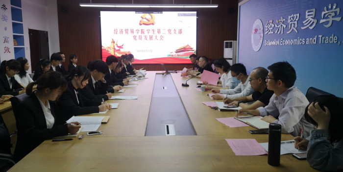 5月27日、28日经济贸易学院学生党支部在五楼会议室召开预备党员接收大会,会议分别由学生第一党支部书记邬金和第二党支部书记陈夺主持,全体正式党员和有关人员参加会议。