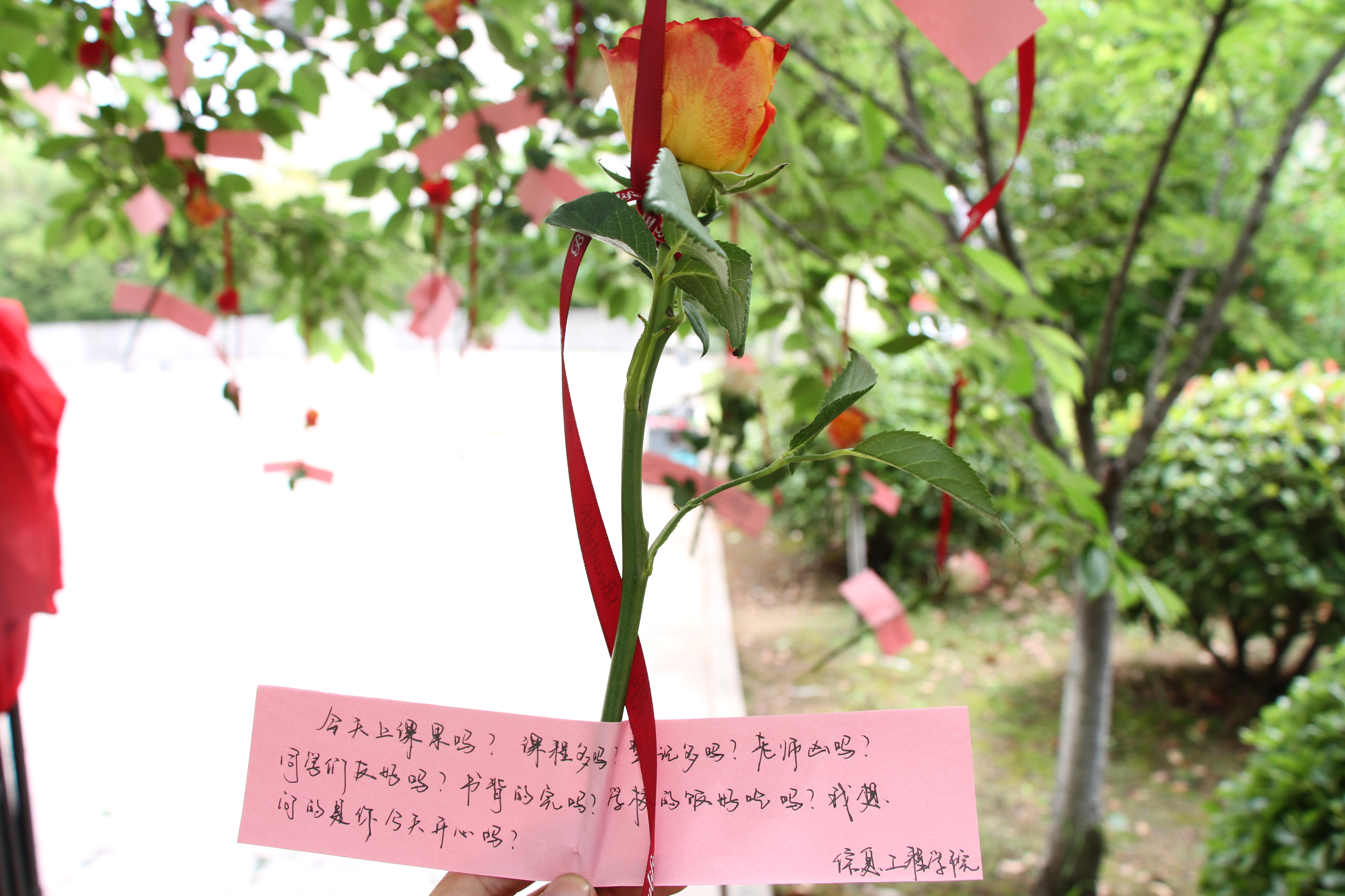 志愿者同学们将鲜花用红丝带轻轻地绑在树枝上,师生们可以自取,也可以由志愿者赠与,每一支鲜花上附有同学们手写的健康温馨且温暖心灵的祝福语。活动现场,同学老师自行选取喜欢的祝福语与鲜花,得到鲜花的老师和同学脸上洋溢着幸福的笑容,赠予鲜花和祝福的同学们感受着给予和奉献的快乐。鲜花的美丽、祝福语的温馨、笑容的温暖交织成一幅美丽馨香的画面。