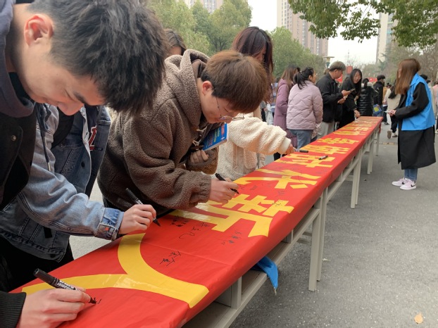 三月的寒风依然凛冽,却挡不住同学们的满腔热情。活动现场,志愿者热情地向同学们宣讲雷锋的故事,路过的同学们纷纷驻足聆听。同学们热情高涨,积极响应,百余名同学纷纷在横幅上郑重签下自己的名字,表达对雷锋同志的崇高敬意,和以雷锋同志为榜样、向雷锋同志学习的决心。