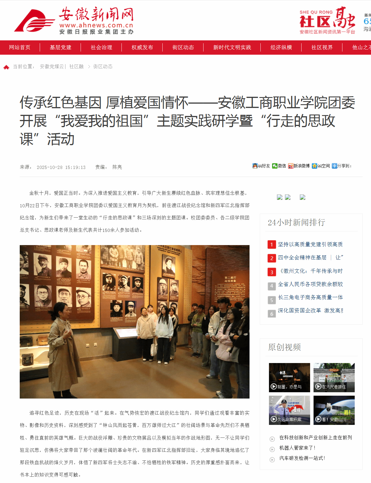 原文链接:【安徽新闻网】报道:传承红色基因 厚植爱国情怀——安徽工商职业学院团委开展“我爱我的祖国”主题实践研学暨“行走的思政课”活动