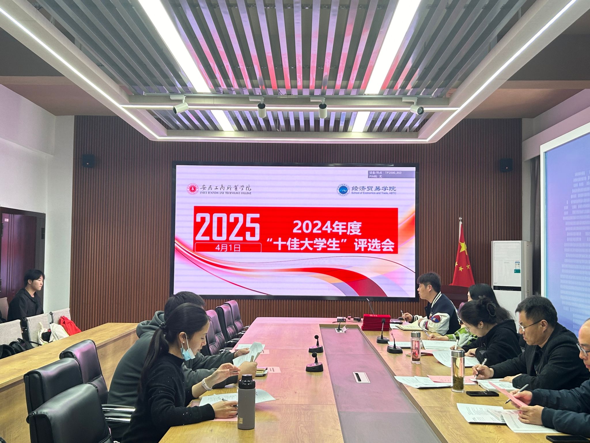 为弘扬榜样力量,激励学子奋进,4月1日中午,经济贸易学院隆重举办2024年度“十佳大学生”评选活动。学院党总支书记边昊、部分总支委员及辅导员代表组成评审团出席现场,共同见证优秀学子的风采展示。
