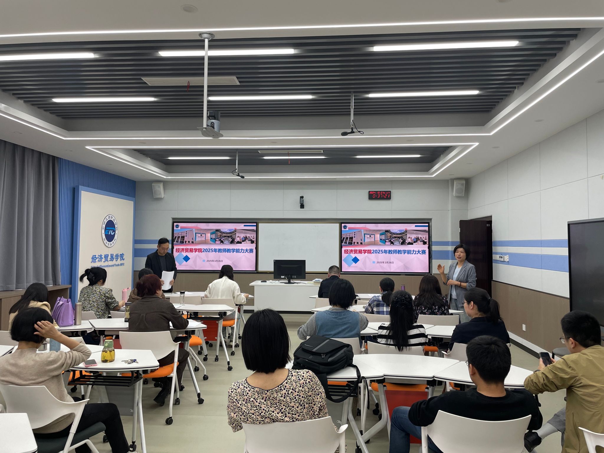 为深化“五金”建设,推进高水平教师教学团队建设,做好校级、省级教学能力大赛选拔推荐工作,2025年3月26日中午,经济贸易学院在多功能智慧实训中心隆重举办2025年教师教学能力大赛。经济贸易学院院长张颖教授出席大赛现场,学院全体教师观摩了比赛。