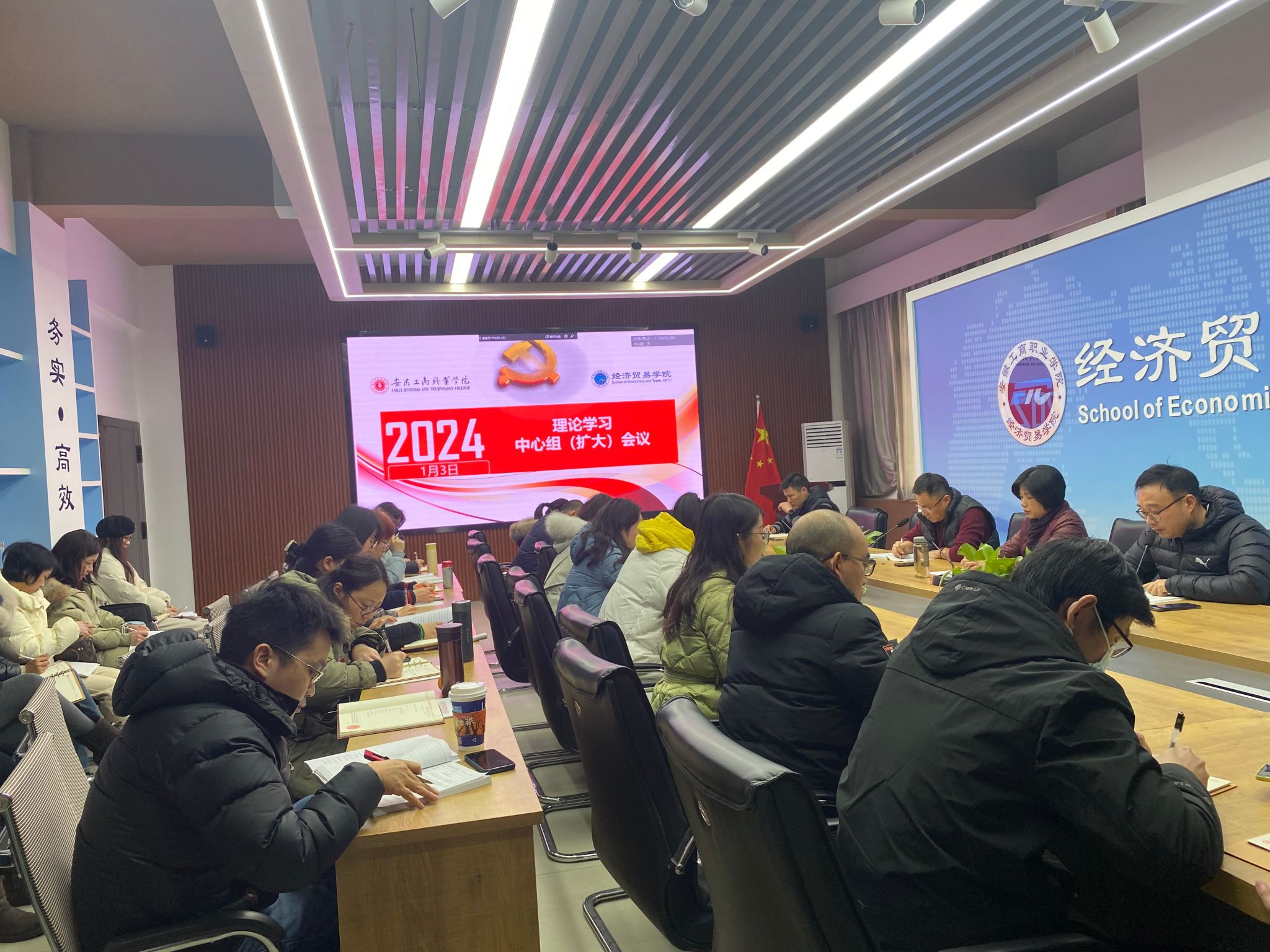1月3日下午,经济贸易学院党总支在5楼教师能力提升中心召开理论学习中心组(扩大)学习会议,会议由党总支书记边昊主持,全体教职工参加会议。