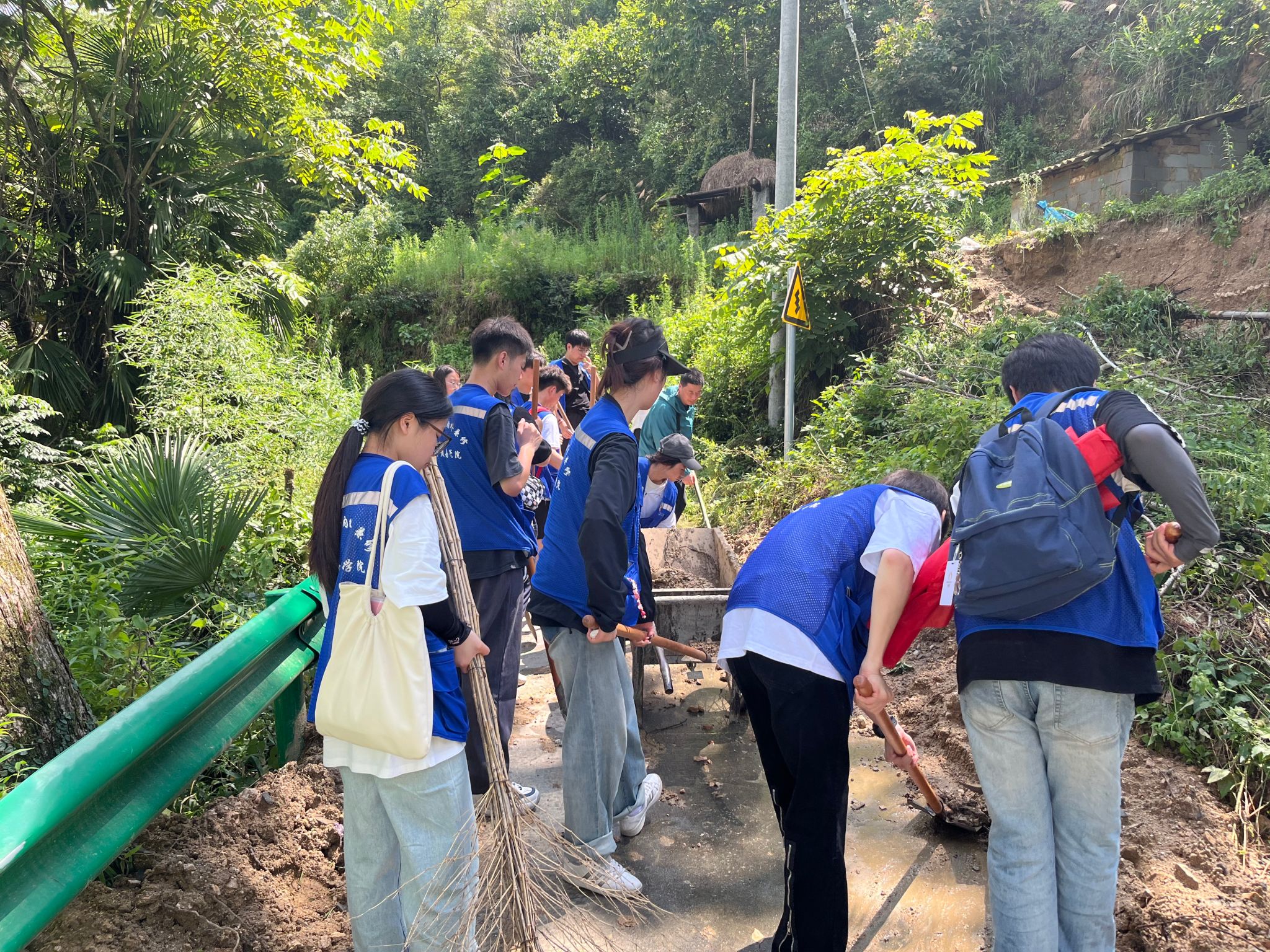 守护青山绿水,共建美好家园。连续的阴雨天导致多处积水,同时前往土桥村路段还有塌方落石,道路受阻。趁着天气好转实践队成员们自发组织前往清理塌方产生的路障,他们发扬“不怕苦、不怕累、不怕脏”的精神,手拿扫把、铁锹,倾身弯腰,即使烈日炙烤,高温难耐,即使浑身污泥,臭气扑鼻,也毫不退缩,一铲一锹地清理着厚厚的淤泥和堆积的石块。汗水湿透了衣衫,手掌被工具磨出了血泡,但他们的眼神中没有丝毫的退缩和抱怨,只有坚定的决心和力量。经过短暂的休息整顿,队员们再次出发清理新时代文明实践站、村委会广场和村路两侧的生活垃圾、柴草杂物、积存垃圾等。大家有序分工,干劲十足,经过努力,垃圾、杂物、杂草得以清除,场地面貌焕然一新。队员们纷纷表示,酷暑的热浪吹不灭我们昂扬的劳动热情,额头虽有细密汗珠,腰间尚有微酸疼痛,但溢满心中的都是奉献带来的不竭快乐。