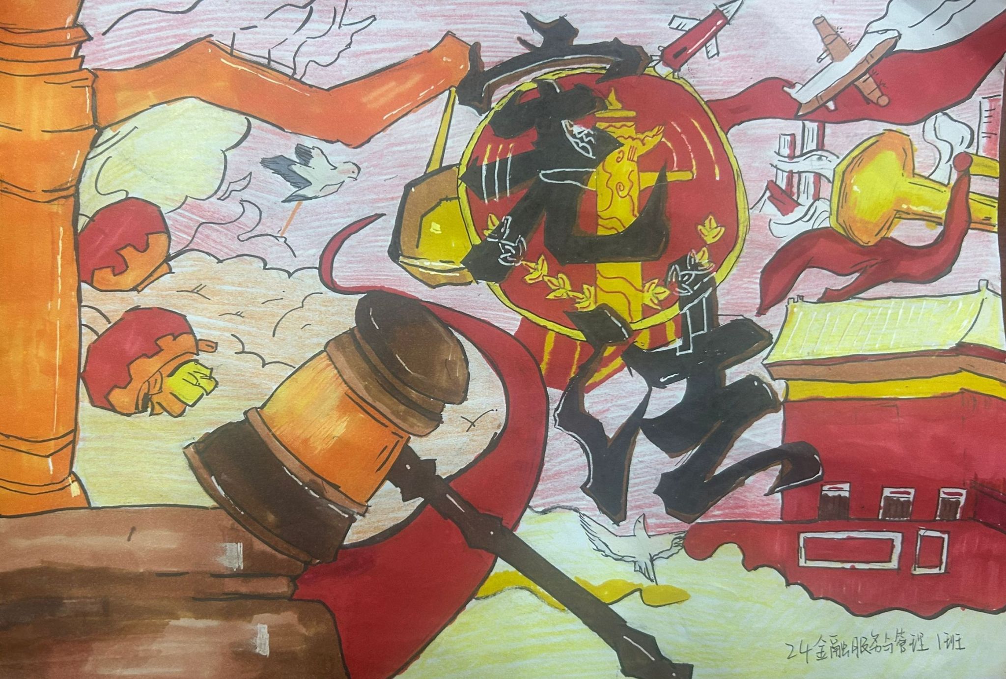 绘宪法,层层入行。学生们创新宪法宣传模式,通过绘制宪法宣传海报,将宪法的抽象概念具象化。一幅幅色彩鲜明、寓意深刻的绘画作品,不仅美化了校园环境,更让宪法精神深入人心。来自商务英语专业的大二同学张梓欣介绍道:“海报作为一种直观的艺术表现形式,能够加深师生对宪法内容和精神的感知与记忆,是法治文化推广的重要途径。”学院团总支书记邬金说:“学生们以实际行动让宪法精神在心里生根开花,不仅增强了学生学法用法的积极性和主动性,而且营造了浓厚的尊法、学法、守法、用法氛围,为法治校园建设夯实基础。