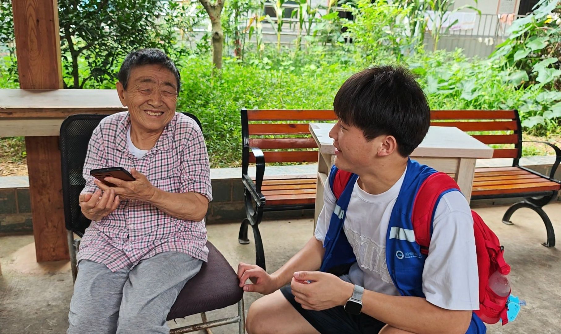青丝白发相对话,薪火相传见真情。敬老院里,一场跨越时空的对话温暖上演。队员们围坐在百岁老人身旁,聆听讲述跨越世纪的人生故事。老人清晰的记忆和乐观的精神深深感染在场的每一个人。退休教师章宏分享着执教生涯中的点滴往事,诉说三尺讲台的育人初心,饱含着对教育事业的无限热忱。队员们轻轻拭去相框上的灰尘,仿佛触摸到历史的温度。“这些老人是活的‘地方志’,他们的故事让我们读懂了坚守的意义。”队员们在交流手记中这样写道。