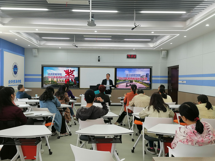 为落实立德树人根本任务,深化“三教改革”,推进“岗课赛证”综合育人,4月26日中午,经济贸易学院2023年教师教学能力大赛在学院多功能智慧实训中心拉开帷幕。经济贸易学院院长张颖教授、安徽省教学能力大赛专家、学校院办方灿林副教授、金融教研室周瀚醇副教授受邀担任现场评委。经济贸易学院全体教师观摩了比赛。