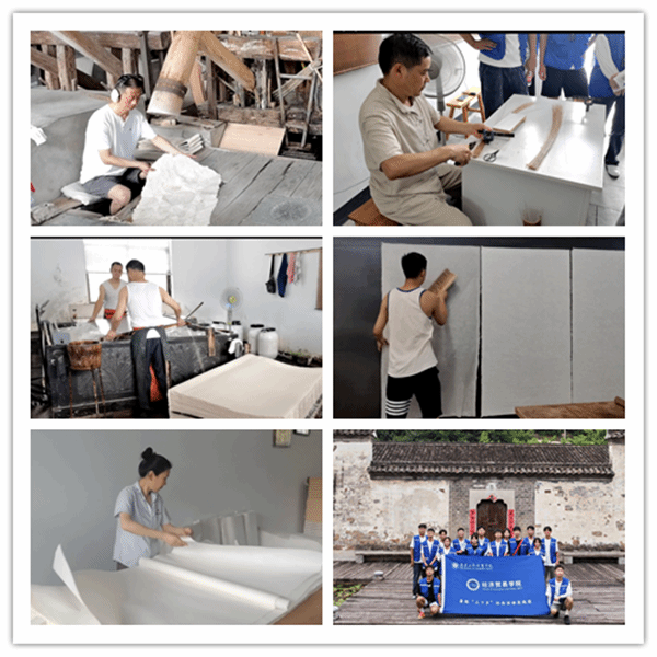 体验非遗魅力 传承传统文化 宣纸,是享誉世界的安徽文化名片。泾县深挖优秀传统文化资源,与现代设计巧妙结合,文化创意产品不断涌现,中国传统文化走出“深闺”,让传承千百年的文化遗产“活起来”、“火起来”,走出国门,走向世界。在中国宣纸文化园,实践团成员们畅游在“宣纸印象”“若水一脉”“雪月风华”“白云深处”“星光灿烂”篇章中,聆听宣纸故事,感悟宣纸的传奇一生。携手体验古法捞纸技艺,一槽纸浆,一张竹帘,一捞一提间,完成了一张演绎着万种风情的宣纸,感受着人类非物质文化遗产的独特魅力。作为中国文房四宝之首、中国四大名笔之一的宣笔,同样吸引了大家的目光。在讲解员的带领下,实践团成员们了解到成笔的每一道工序。缕齐毛尾,牙刷梳理 ,乳胶固定……每个步骤,成员们仔细学、埋头做,一道道工序,全应古制,仿佛看到了白居易描述的“千万毛中拣一毫”的场景。