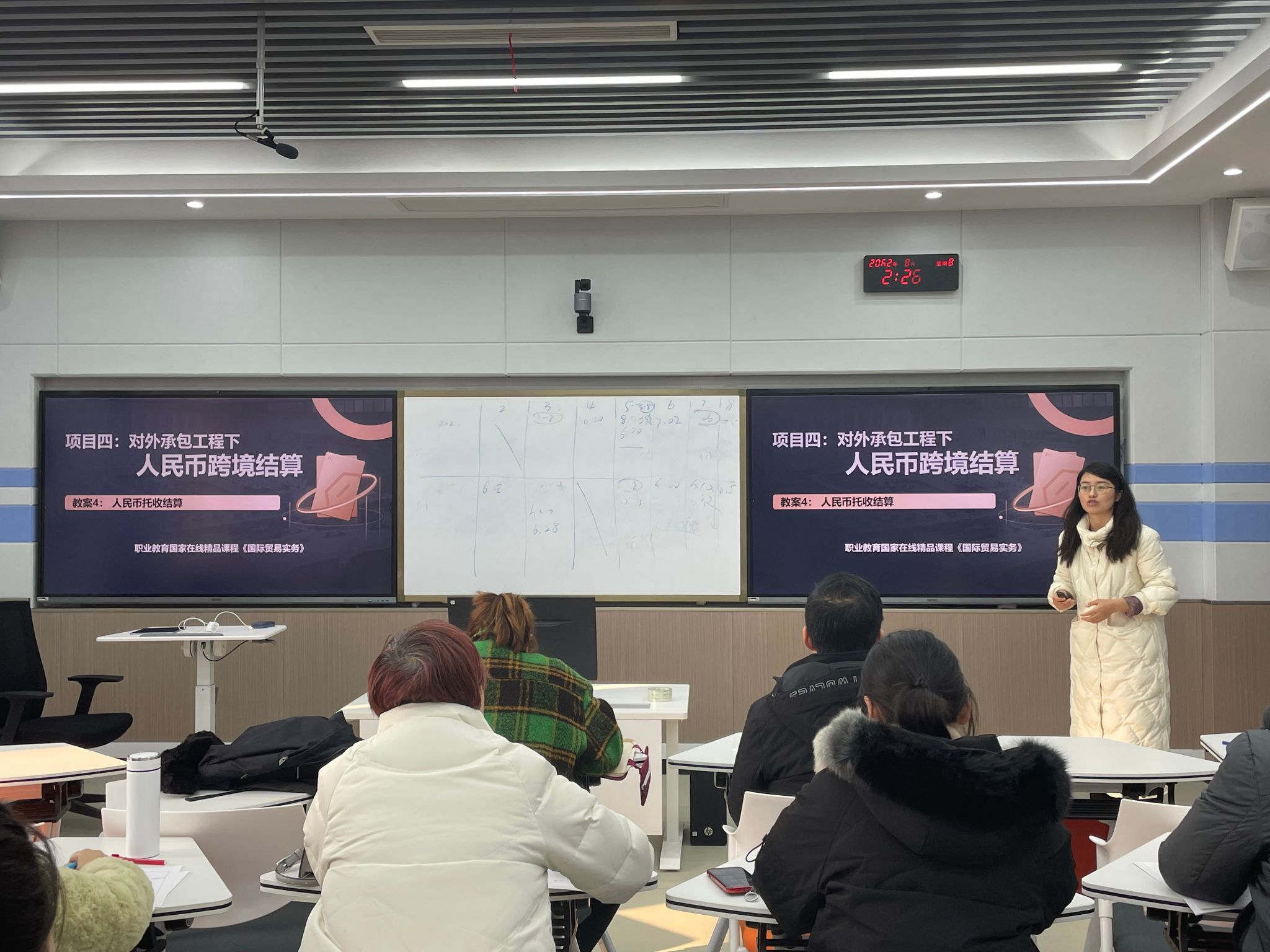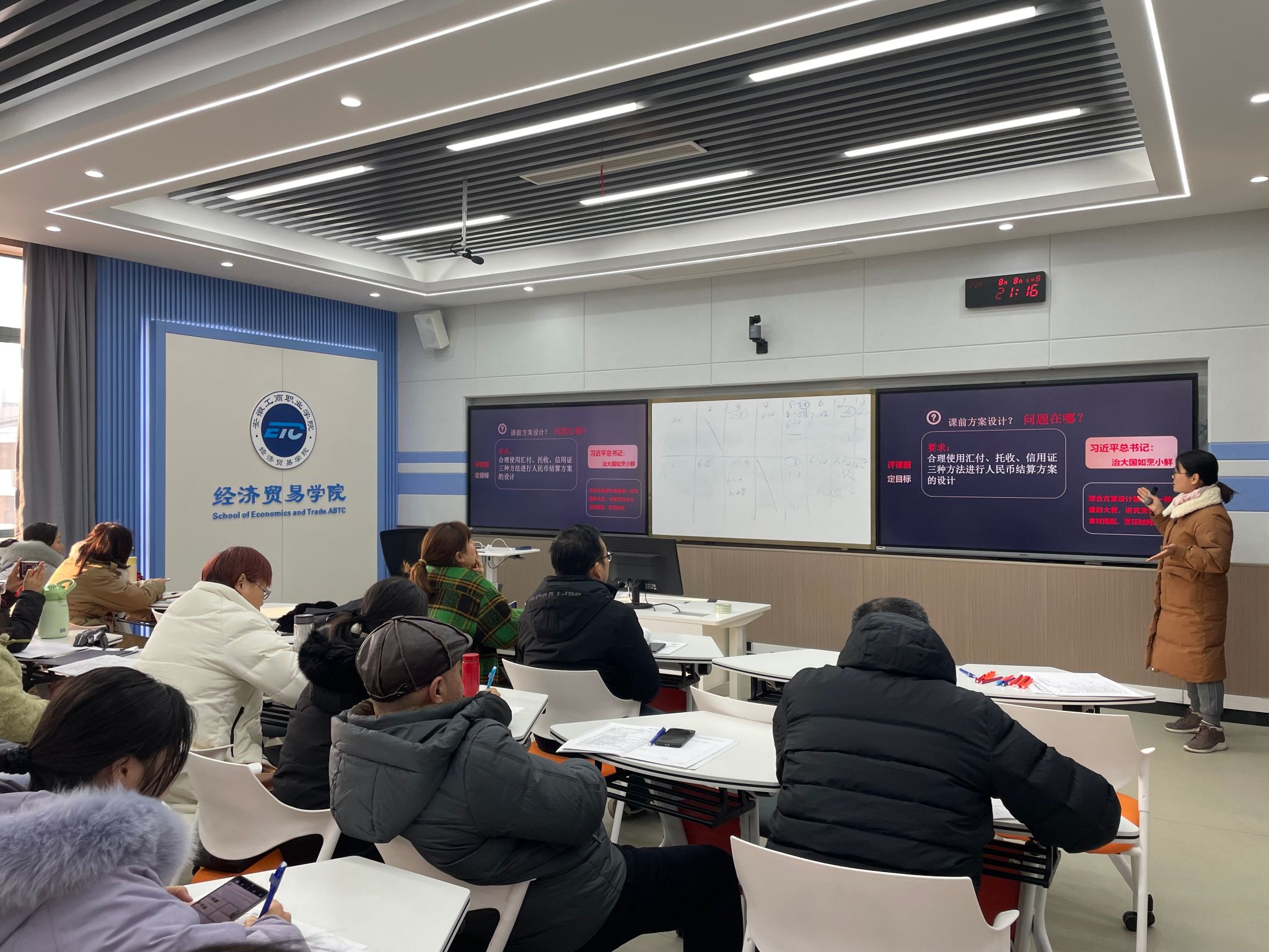我院获得2023年安徽省教师教学能力大赛一等奖的教学团队成员黄锐、刘兰兰、朱清涟三位教师先后通过公开课的形式向大家展示了获奖作品“对外承包工程下人民币跨境结算”。他们结合团队的参赛经历与经验,对教学内容的选择、教学场景的布置以及信息化手段使用等方面做了详细讲解,分享了教学设计思路、学生学法、教师教法、考核方式等方面内容。会上,获奖教师与现场人员进行了热烈交流和互动。