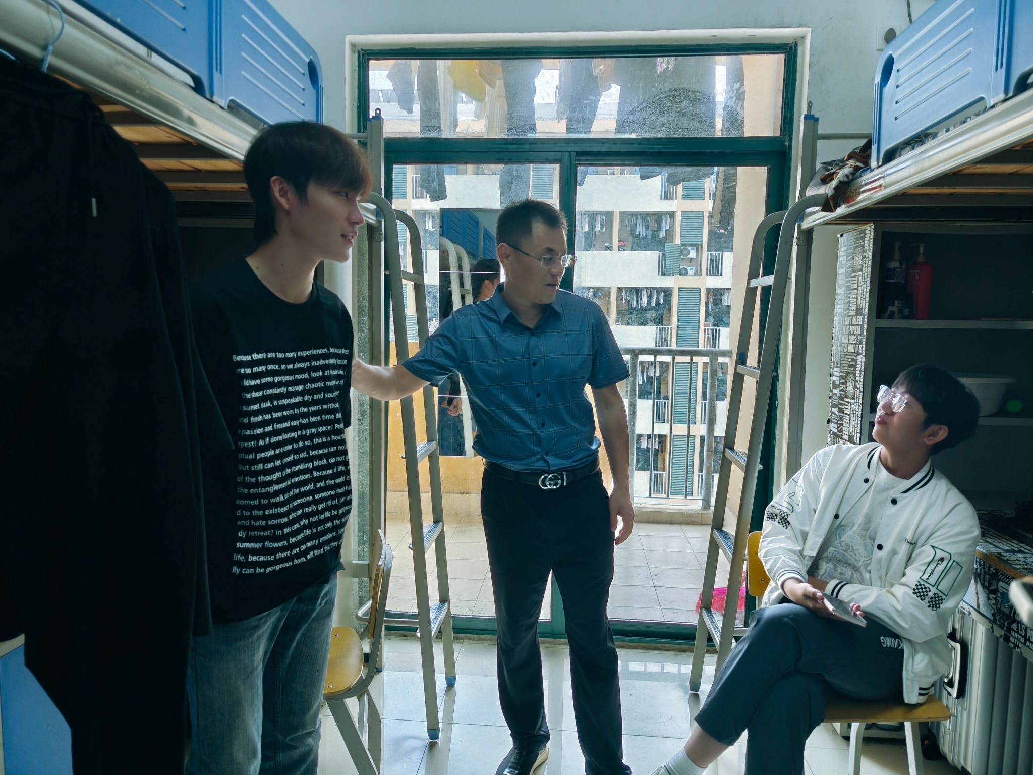 在走访过程中,党总支书记边昊与新生们进行了亲切的交流,详细询问了他们的入住情况、生活适应情况以及未来规划等,他着重强调了宿舍安全的重要性,提醒同学们注意用电安全、财物安全以及个人卫生;并希望同学们能够相互帮助,共同营造一个和谐、温馨、安全的住宿环境;鼓励新生们积极参与学院组织的各项活动,拓宽视野,增长见识,丰富大学生活。