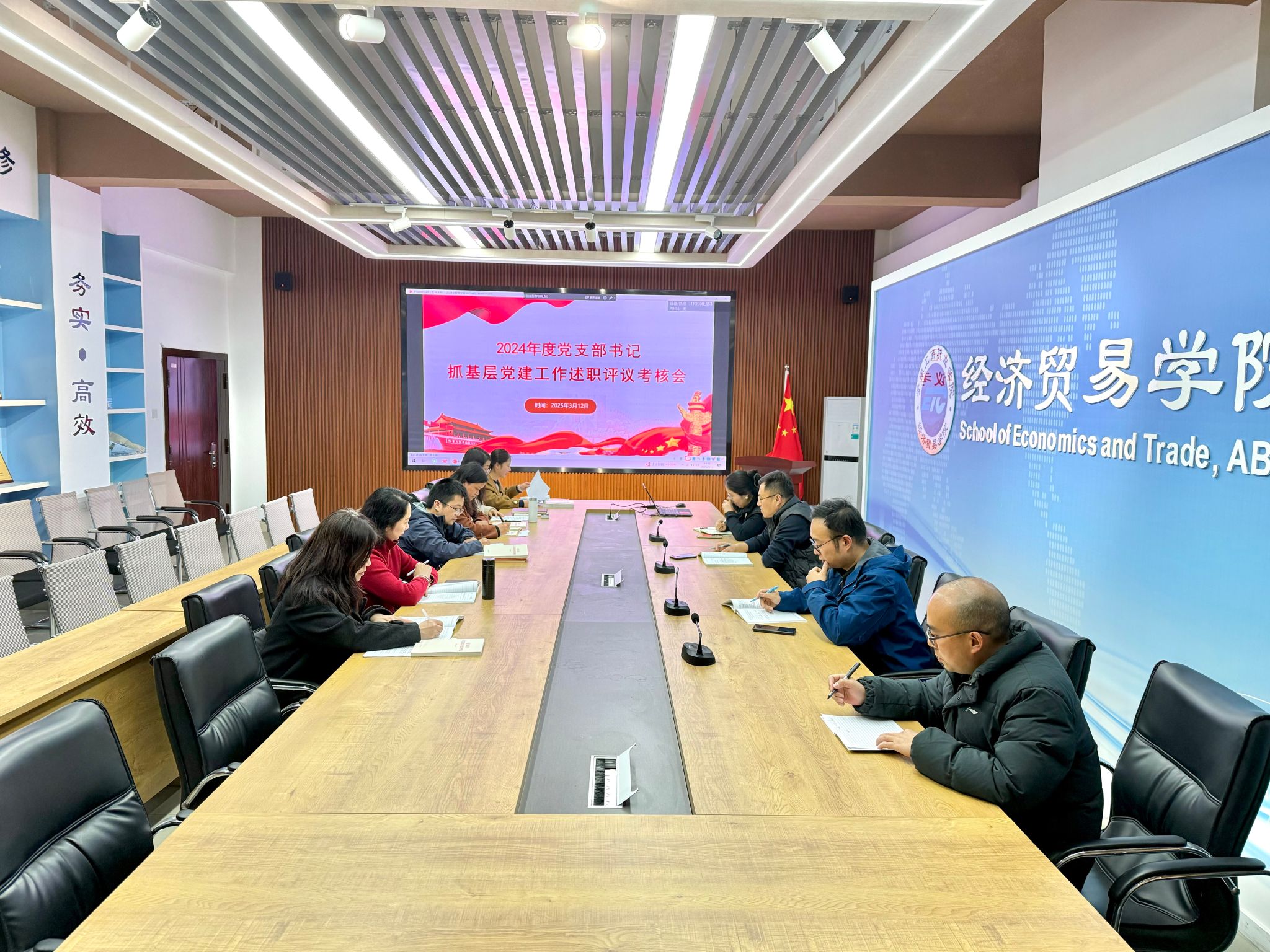 为深入学习贯彻习近平新时代中国特色社会主义思想,认真学习贯彻党的二十大和二十届二中、三中全会精神,进一步推动全面从严治党向基层延伸,加强基层组织建设,经济贸易学院于3月12日在五楼会议室开展党支部书记抓基层党建述职评议大会,会议由党总支书记边昊主持,学院党总支委员、各党支部书记参加会议。