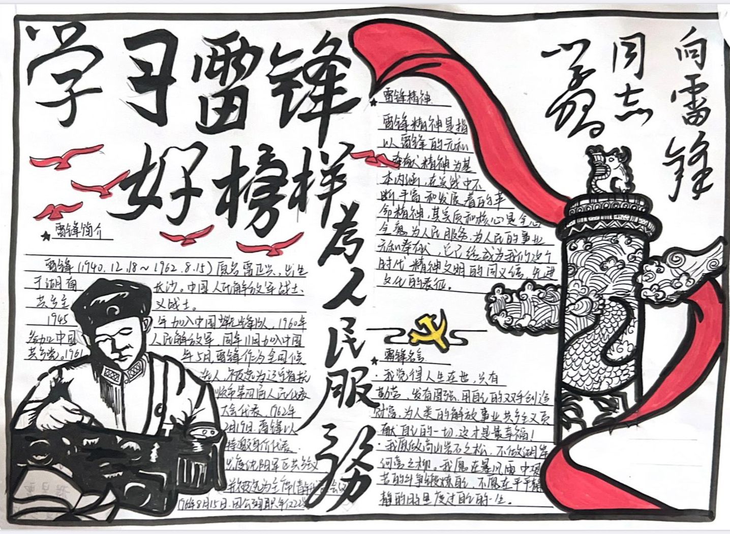 此次雷锋月手抄报活动是经济贸易学院团总支雷锋月系列活动的重要组成部分。通过全员参与、全程引导、全方位覆盖的活动设计,将德育与美育有机融合,以润物无声的方式,进一步强化青年学子的社会责任感和奉献意识。后续,学院团总支将继续创新活动形式,丰富实践载体,推动学雷锋活动常态化、长效化,为培养德才兼备的新时代青年注入红色力量。(撰稿:邬金 审核:马莉 边昊)