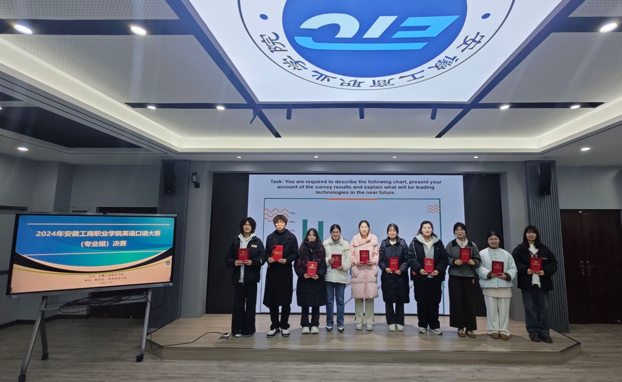 为加快推进我校商务英语专业建设和课程教学改革,践行“以赛促学、以赛促教”理念,不断提高学生英语口语技能,同时也对接2024年“中银杯”安徽省高等职业院校技能大赛英语口语赛项(专业组)比赛,2024年12月31日下午,由经济贸易学院承办的2024年安徽工商职业学院英语口语大赛英语专业组决赛在经济贸易学院外贸综合实训室举行。经层层选拔,来自商务英语专业的100多名同学参加了初赛和复赛,最终10名同学进入决赛。