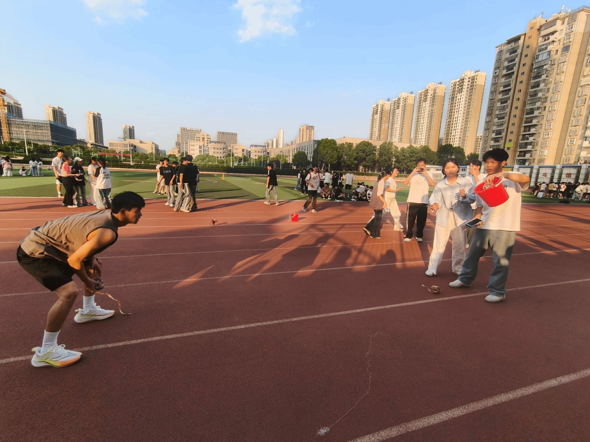 旋风跑和拔河项目将运动会的气氛推向了高潮。旋风跑比赛中,八名队员手握器材围绕标志杆快速奔跑,他们齐心协力,步伐整齐,在赛道上形成了一道亮丽的风景线;拔河比赛现场,双方队员紧握长绳,使出全力、身体后倾往后拉,加油声、呐喊声此起彼伏,充分展现了同学们团结一心、奋勇拼搏的精神风貌。