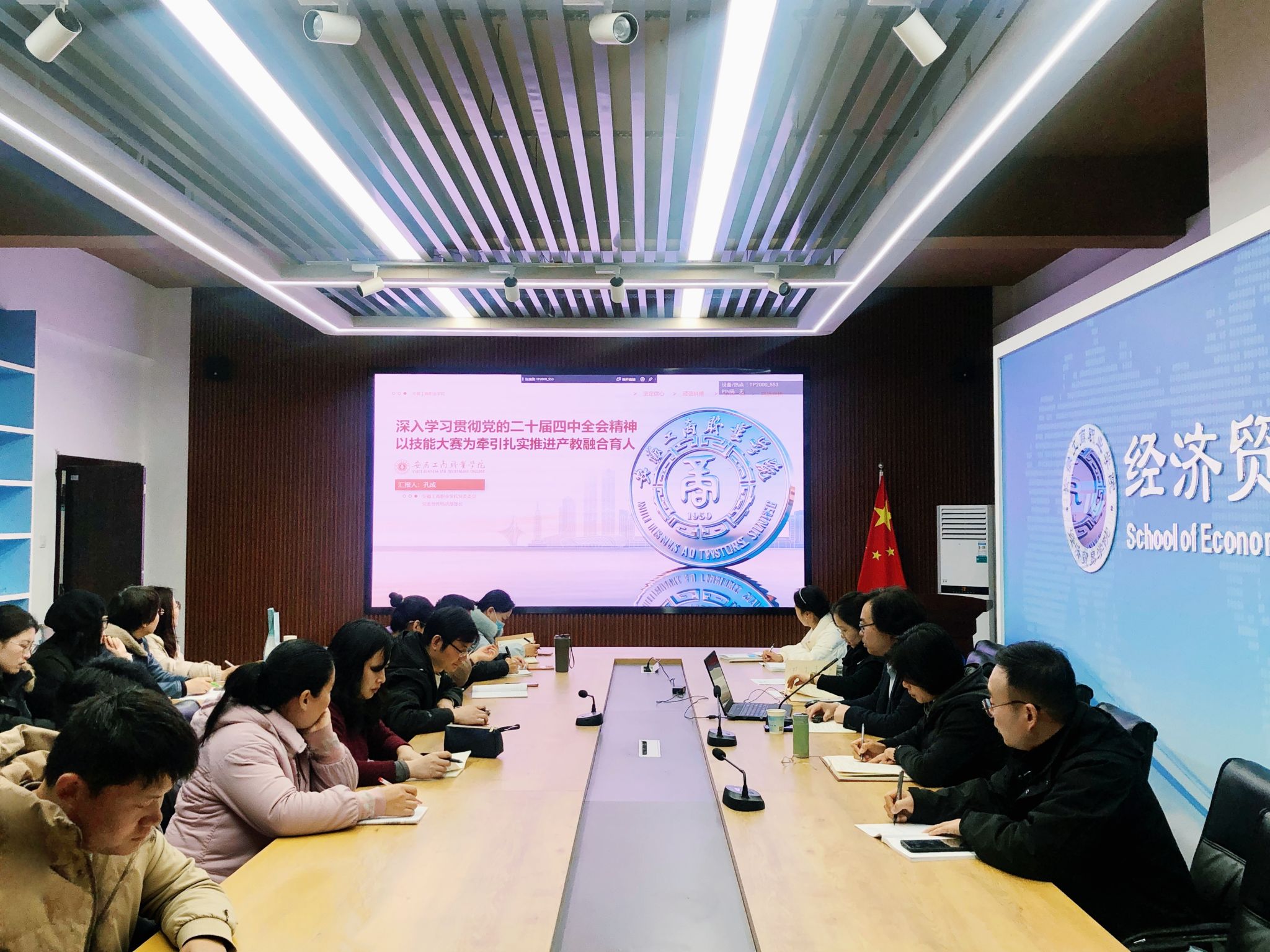 为深入学习贯彻党的二十届四中全会精神,凝聚思想共识,激发奋进力量,12月23日中午,学校党委委员、党委宣传统战部部长孔成以“深入学习贯彻党的二十届四中全会精神,以技能大赛为牵引扎实推进产教融合育人”为主题,为经济贸易学院全体教师讲授专题党课,会议由经济贸易学院党总支副书记马莉主持。