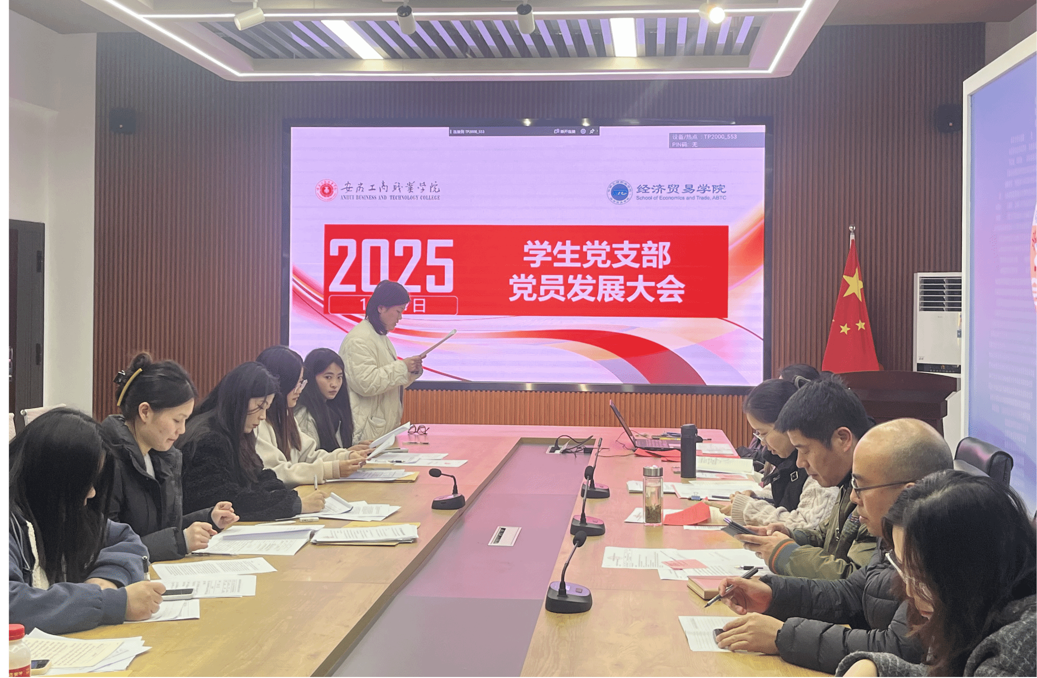 为持续夯实党员队伍建设根基,提升组织活力与战斗力,2025年12月17日下午及12月31日中午,经济贸易学院学生第一党支部先后于学院五楼会议室召开党员发展大会与党员转正大会。支部书记朱清涟主持会议,学院党总支副书记马莉、支部全体党员、以及发展对象参加了会议。