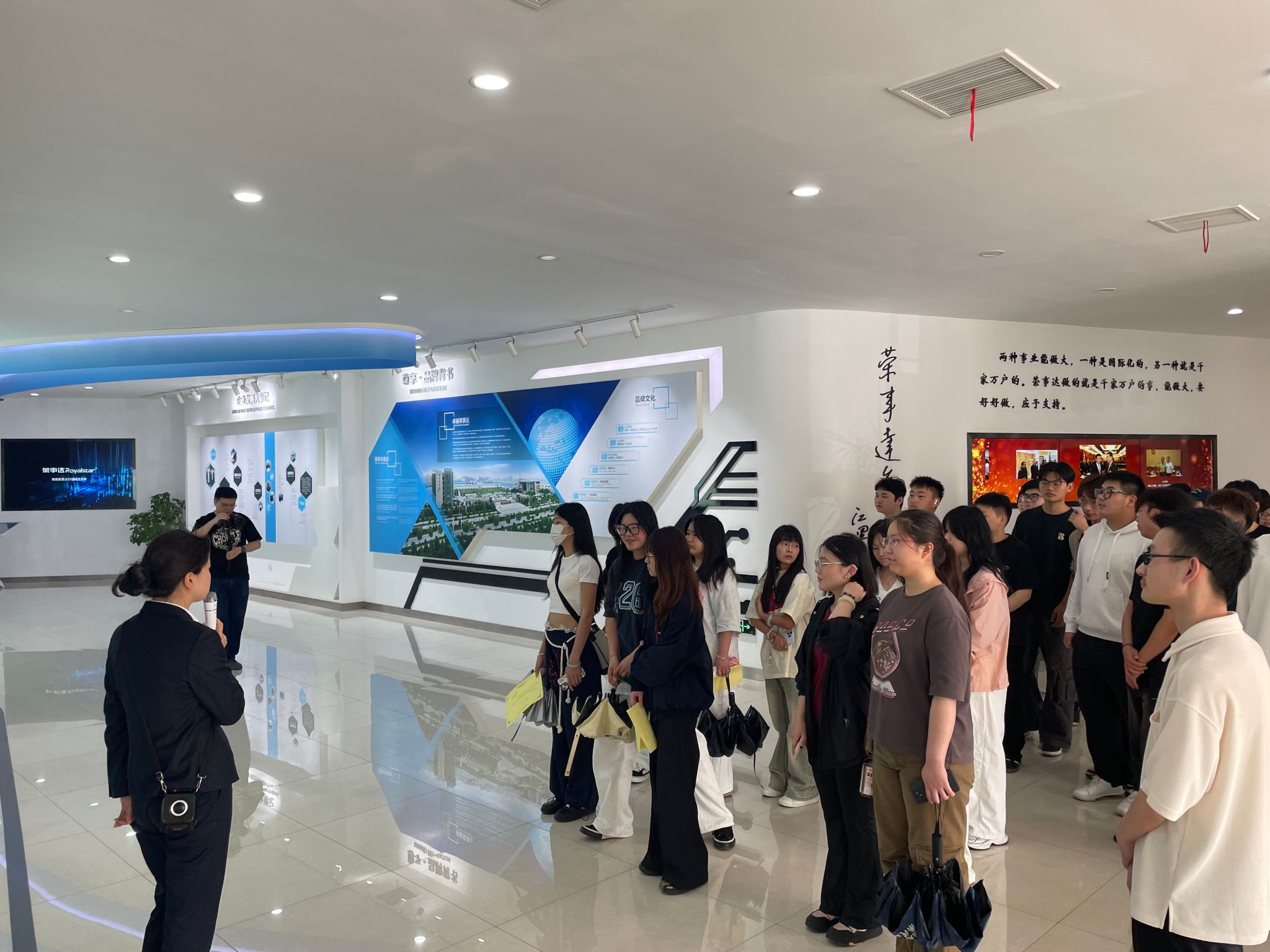 荣事达双创展厅占地面积约2000平方米,分为产品展示区、互动体验区、创新实验室等多个功能区域。展厅内陈列着荣事达近年来研发的各类智能家居产品,如智能冰箱、智能洗衣机、智能门锁等,这些产品充分展示了荣事达在物联网技术应用方面的领先地位。同学们充分感受到荣事达在家居产品层面的科技融合与创造。