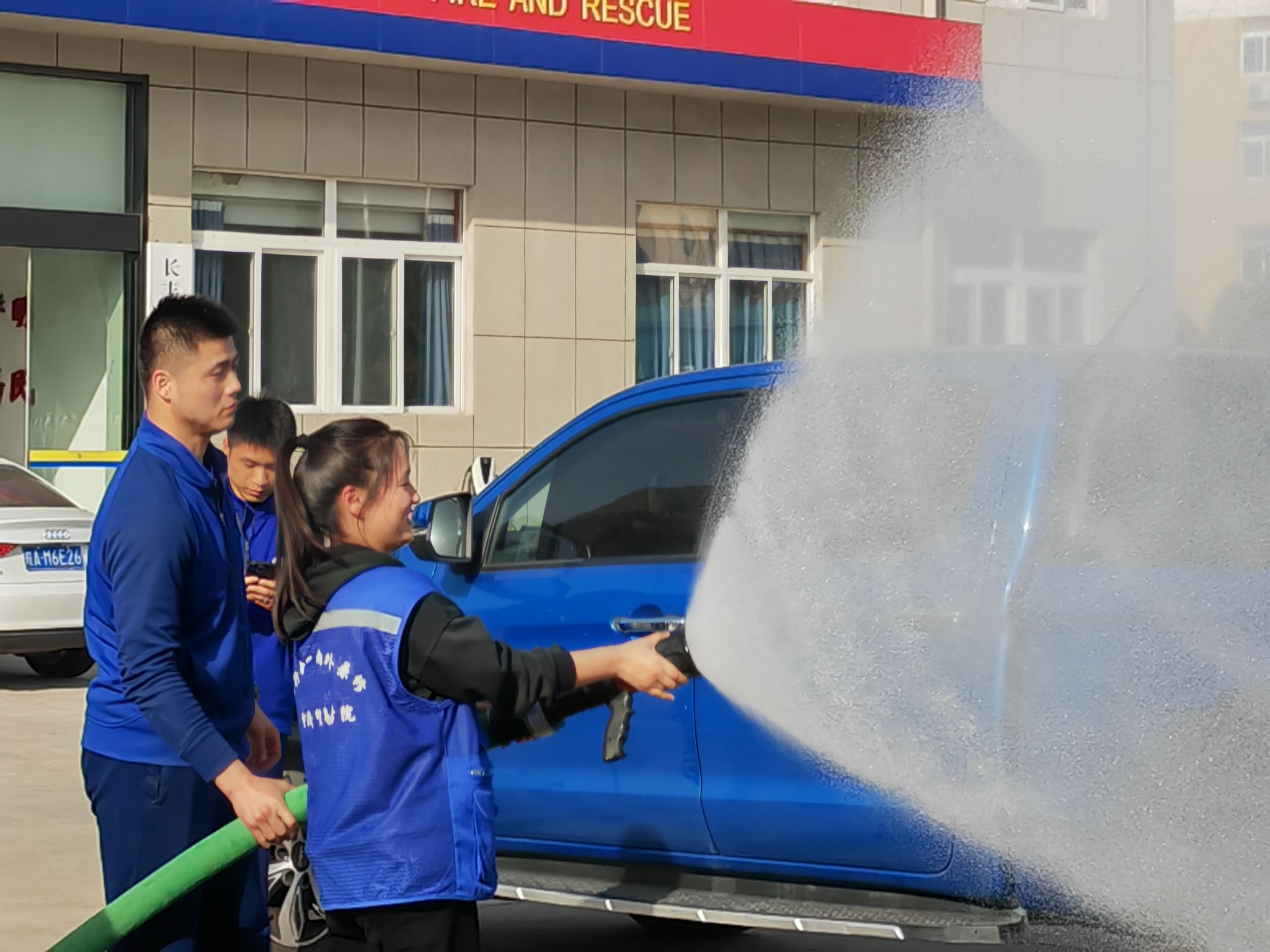 同学们到达消防站后,消防救援站负责人带领同学们参观了消防车和消防工具,还详细讲解了火灾的预防知识,“火灾逃生要正确佩戴防烟面罩,谨记:开、拔、套、拉”,以及火灾报警的要点、灭火器使用和家庭火灾自救的方法。在装备展示区,消防队员详细介绍了执勤车辆、各类器材装备的技术性能、作用和用途以及各种器材在灭火救援战斗中的使用方法和作用;“消防水带连接完毕后,至少要有2人握紧水枪,对准火场,另外一人缓慢打开消火栓阀门至最大,对准火场根部进行灭火。”同学们持灭火水枪,切实体验消防队员手持水枪时的后坐力,深刻感受消防队员的工作情景。