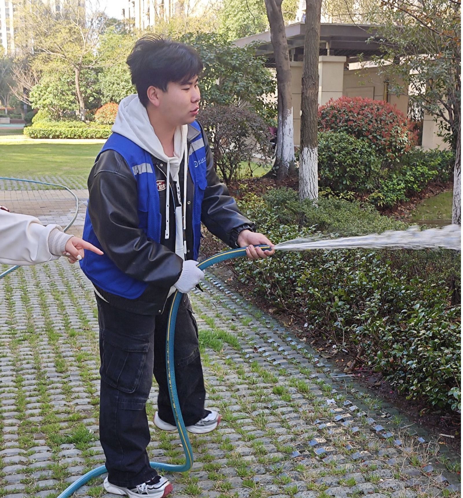 活动当天,同学们身着“经贸蓝”,分为五组前往社区管辖的五个小区,手持工具细致清理路面烟头、纸屑及绿化带中的白色垃圾,对卫生死角展开“地毯式”排查;同时为社区绿植浇水养护,修剪枯枝杂叶,助力社区焕发春日生机。春寒未消,但同学们热情似火,忙碌的身影穿梭于楼宇间。“这些年轻人干得认真又细致,连角落里的垃圾都不放过!”社区居民王阿姨感叹道。峰宁社区负责人表示:“同学们的加入为小区环境治理增添了活力,活动既能美化社区环境,更是一堂生动的社会实践课,经贸学子用实际行动扮靓家园,展现了新时代大学生的责任担当,为基层治理增添了温暖亮色。”