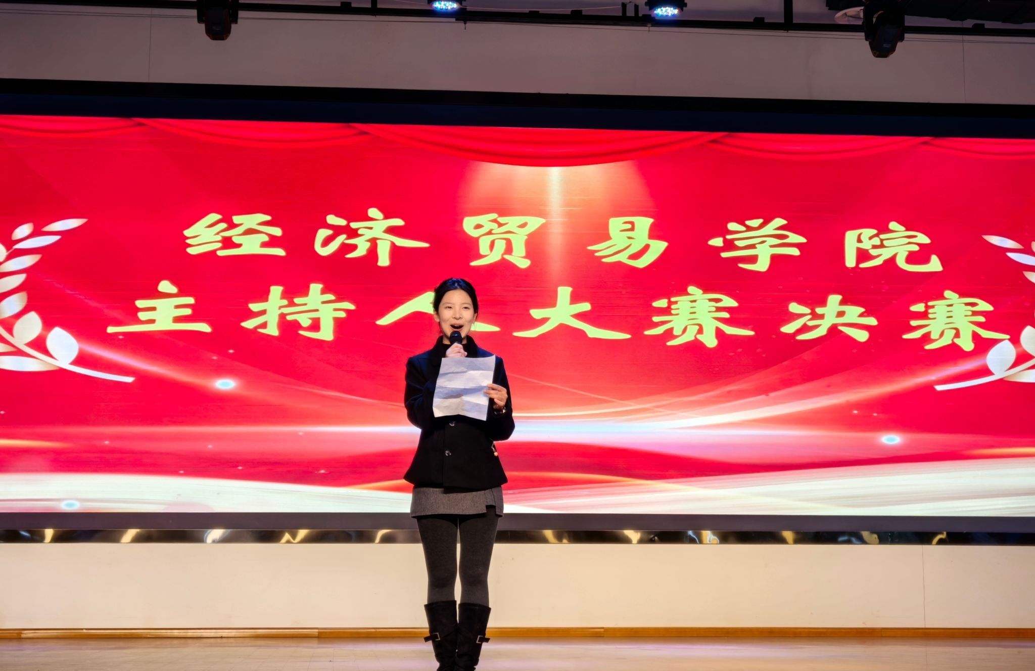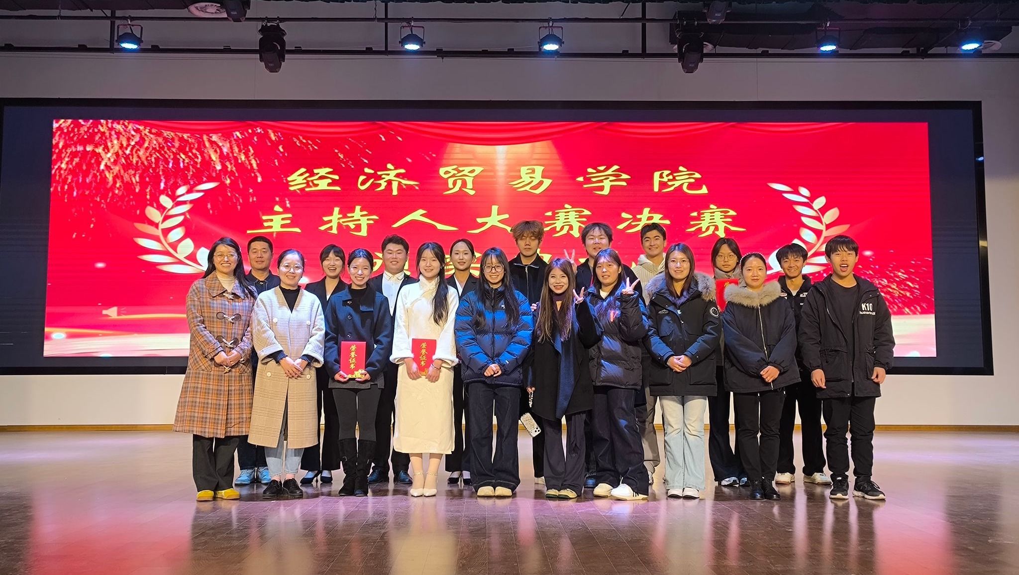 12月3日,经济贸易学院新生主持人大赛在大学生活动中心圆满落幕。本次比赛以“声动青春,语绎风华”为主题,通过“自我介绍”“才艺展示”“模拟主持”三大环节,全面展示了新生的艺术才华与专业素养,生动诠释了智育与美育的有机结合。