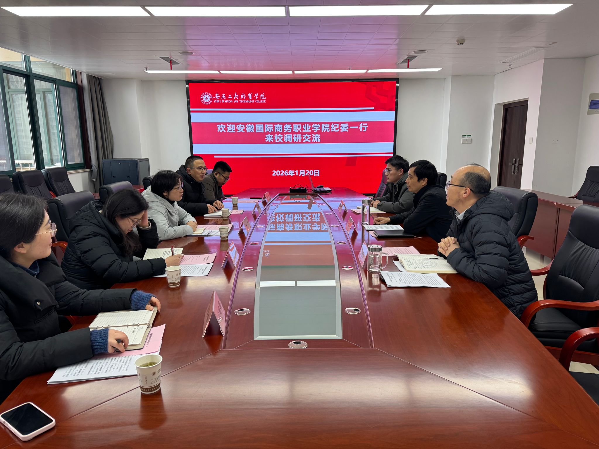 1月20日下午,安徽国际商务职业学院党委委员、纪委书记张翌一行来我校调研交流纪检工作。校党委委员、纪委书记吴松飞主持座谈会,纪委副书记、纪委办主任耿艳军等参加座谈会。