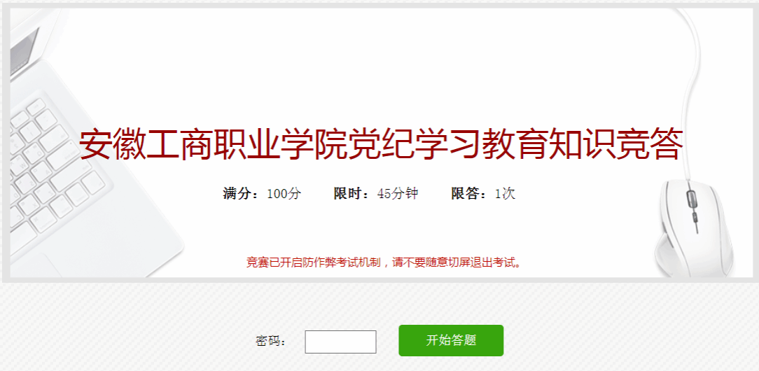 注册完成后,输入答题密码ahbvc,输入姓名,工号/学号,选择所属党组织,即可进入平台答题。