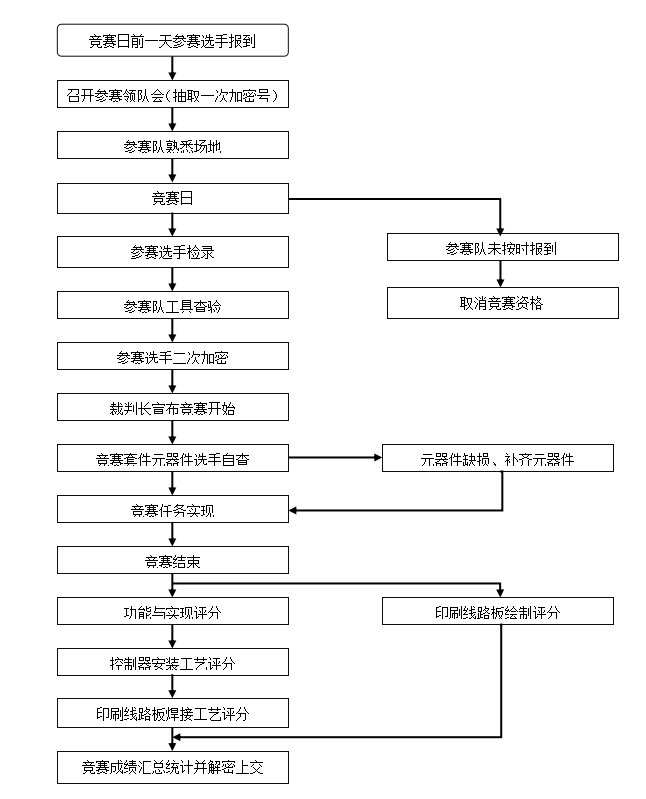 竞赛时间为6小时。各竞赛队在规定的时间内,独立完成“竞赛内容”规定的竞赛任务。采用印刷线路板图绘制、控制器的硬件焊接组装和调试、硬件故障诊断及维修、控制器的指定功能实现(软件的编写和调试)同步竞赛的方法进行。绘制的线路板不加工,对线路板电子稿进行评分;绘制的线路板与焊接安装用线路板约束条件不同(约束条件指线路板安装尺寸、形状、接线口位置);编程选手采用已有的硬件套件进行编程,完成控制器的指定功能要求。
