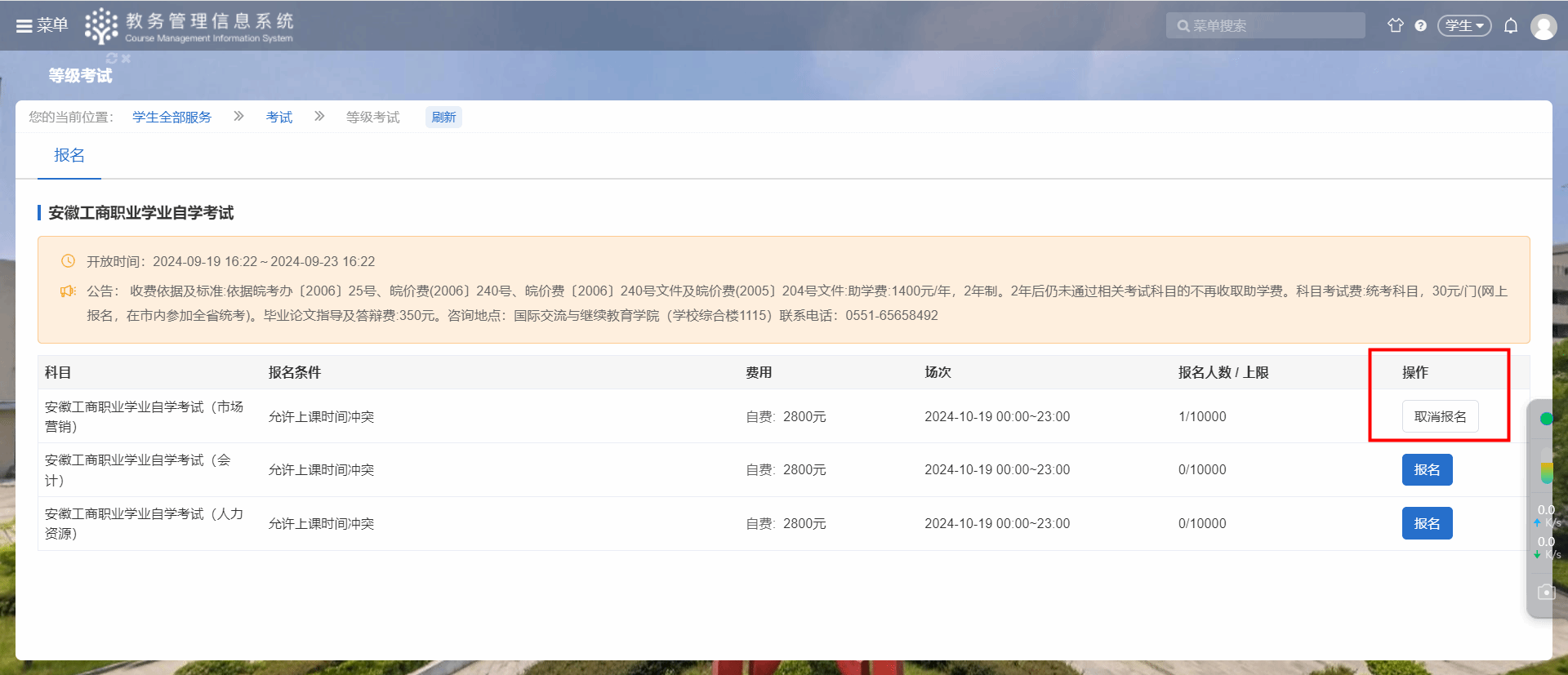 3、报名完成后,也可在首页取消报名,以及查看已报名的等级考试。