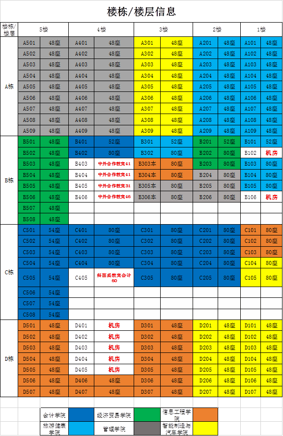 3.经济贸易学院。分配教室总数11个,其中大教室数量2个。