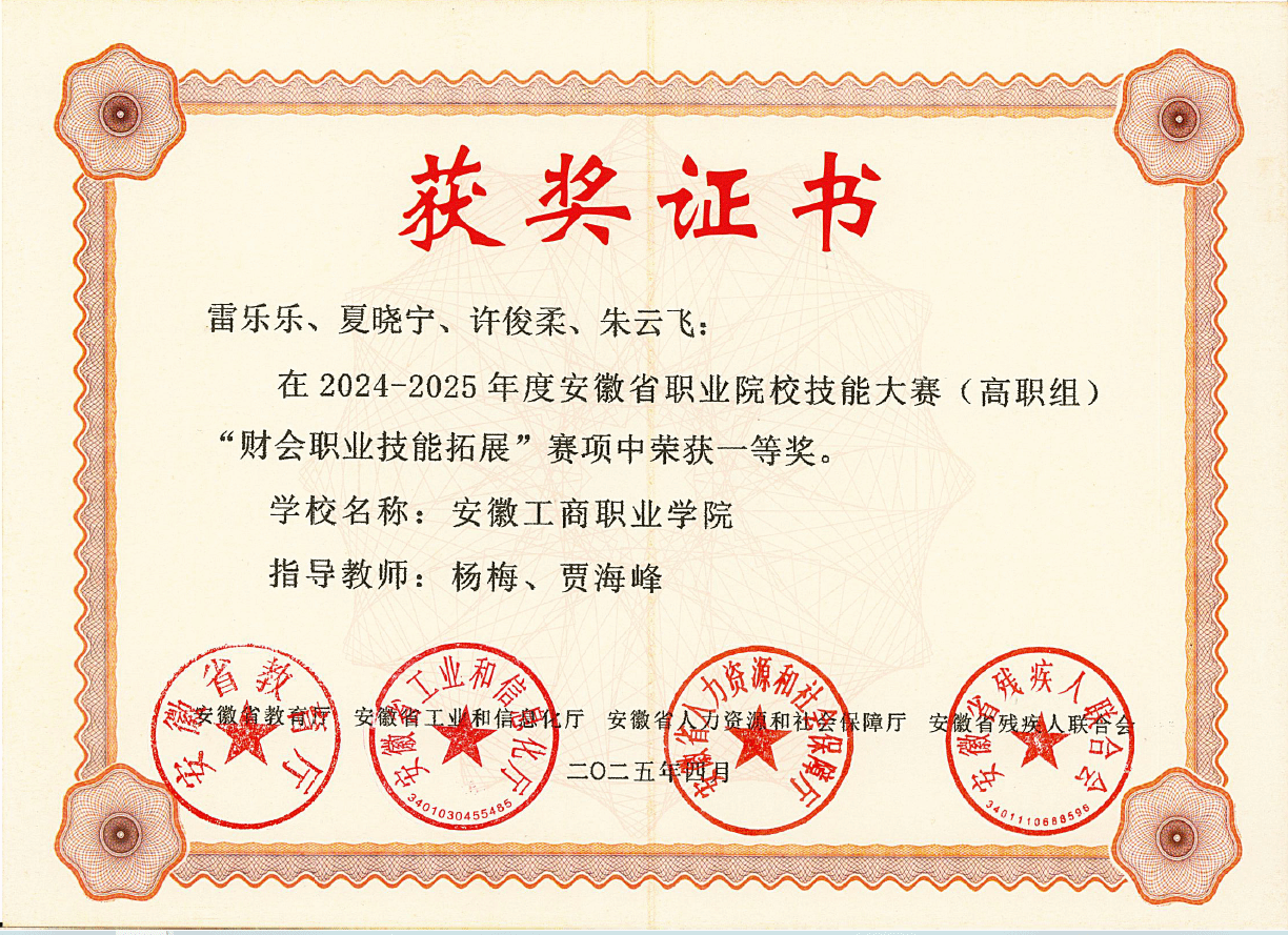 2024-2025年度安徽省财会职业技能拓展竞赛高职组获一等奖2项。