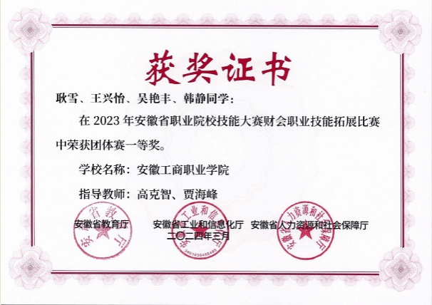2024年安徽省大学生财会技能创新大赛高职组获一等奖、二等奖、三等奖各1项。