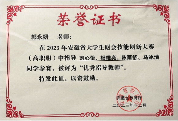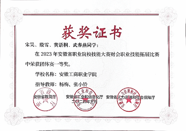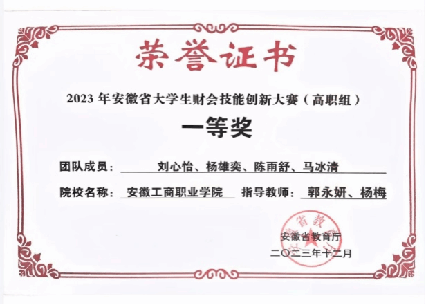 2023年安徽省大学生财会技能创新大赛高职组获一等奖1项。
