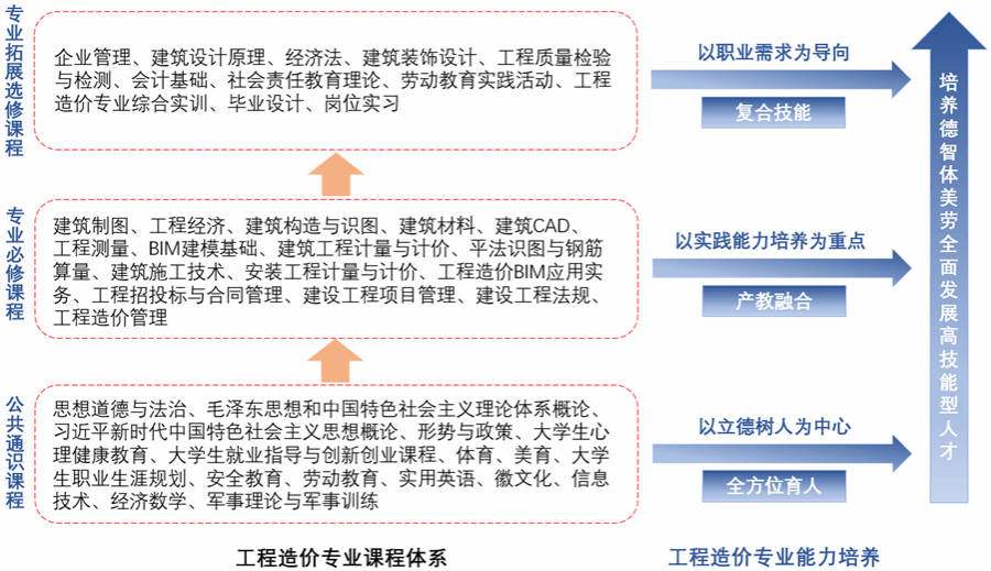按照宽口径、厚基础、高素质、强能力的人才培养规格;本专业面向培养建筑施工一线技术与管理人员,培养思想政治坚定,德智体美劳全面发展,综合素质优良,德技兼修,适应社会主义现代化建设需要,具备一定的科学文化水平,良好的人文素养、职业道德和创新意识,精益求精的工匠精神,较强的就业能力和可持续发展的能力素质,掌握工程造价基础理论和专业知识,具备较强的实践能力,能够从事工程造价、工程项目管理等方面工作的高素质技术技能人才。