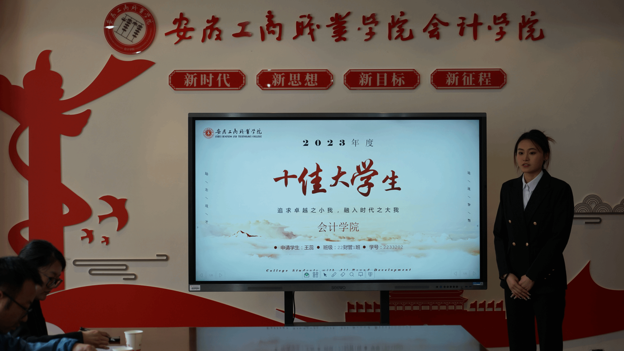经学生本人申请、班级推荐,共有22名十佳大学生候选人参加评审。候选人分别结合各自申报的思想成长、学业科研、创新创业、社会实践、志愿服务等类别,从不同角度、多个方面分享了成长历程、获奖成果、未来展望等,他们以独特的魅力、优异的成绩、丰富的实践赢得了现场评委的认可与好评。最终王蕊等10名同学获会计学院“十佳大学生”荣誉称号,付鑫铖等10名同学获会计学院“优秀大学生”荣誉称号。