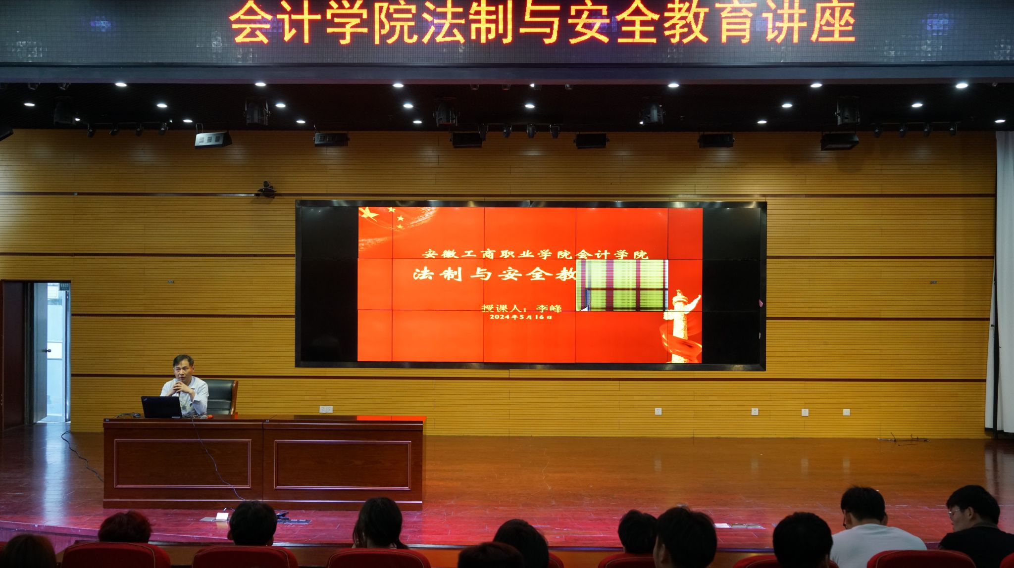 为提高在校学生法律意识,提高法治和安全素养。5月16日下午会计学院在学术报告厅召开法制与安全教育讲座,会计学院党总支副书记李峰主讲,会计学院部分班级学生及辅导员300多人参加。