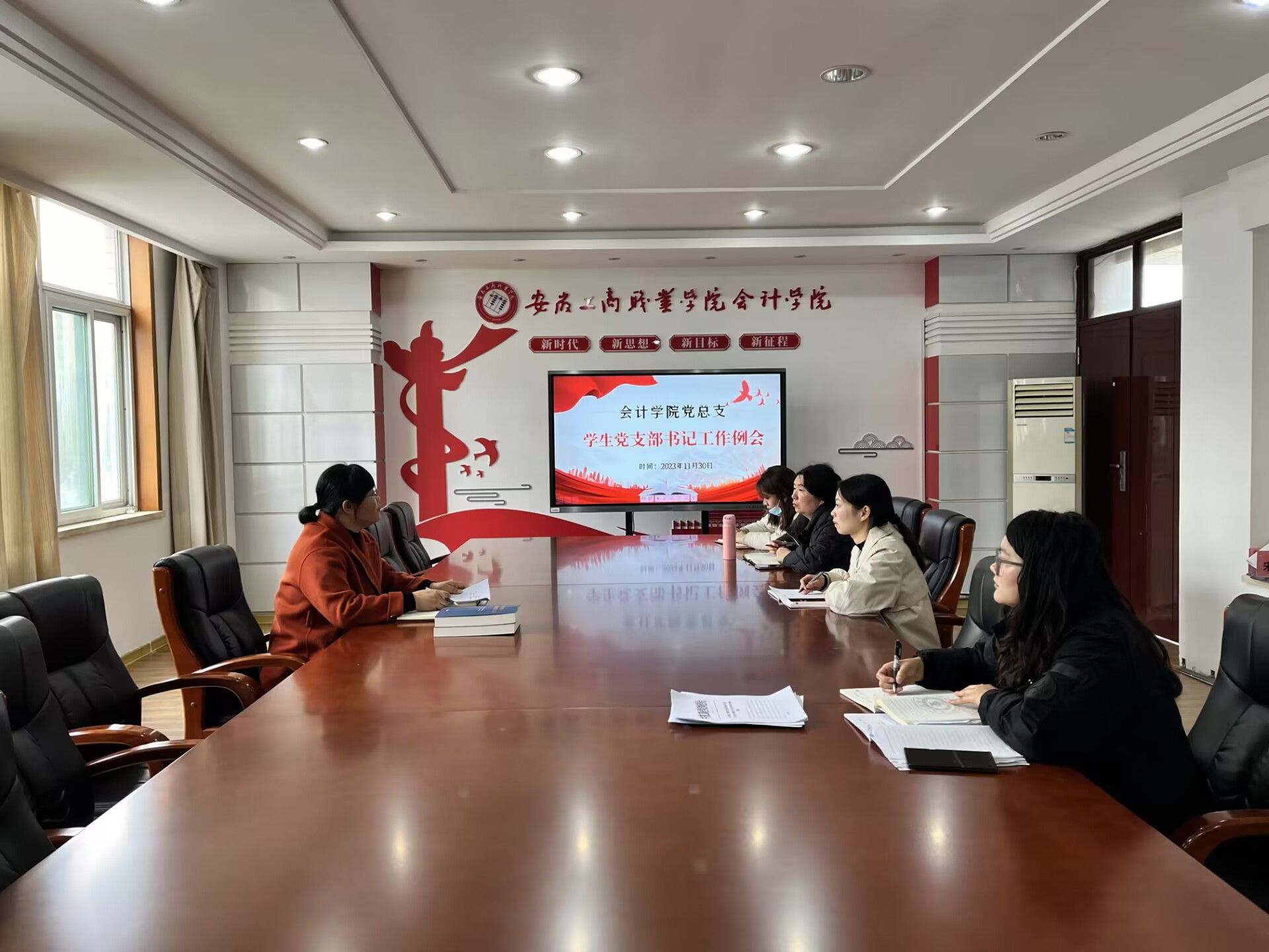 为加强学院各学生党支部建设,切实提高党建工作质量和工作水平。2023年11月30日,会计学院党总支在明德楼二楼党建会议室召开学生党支部书记工作例会。会计学院党总支书记赵艳和全体学生党支部书记出席会议。