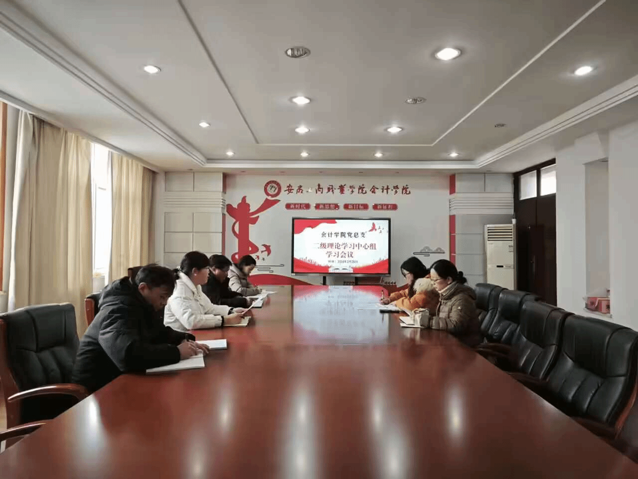 2024年2月28日下午,会计学院党总支在明德楼二楼党建会议室召开二级理论学习中心组学习会议,集体学习了习近平总书记在中共中央政治局第十一次集体学习时、二十届中央纪委三次全会上、二〇二四春节团拜会上的重要讲话精神,学习2024年全国教育工作会议精神,学习安徽省十四届人大二次会议精神和《中国共产党纪律处分条例》等。学习会议由学院党总支书记赵艳主持,全体党总支委员参加会议。