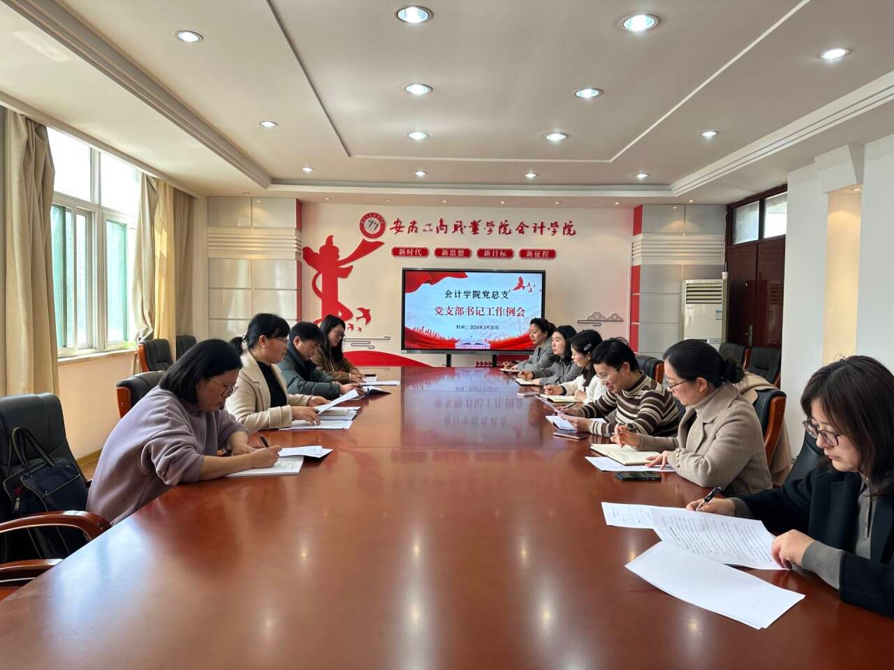 2024年3月6日,会计学院党总支在明德楼二楼党建会议室召开3月党支部书记工作例会,党总支书记赵艳、副书记李峰和全体党支部书记参加会议。