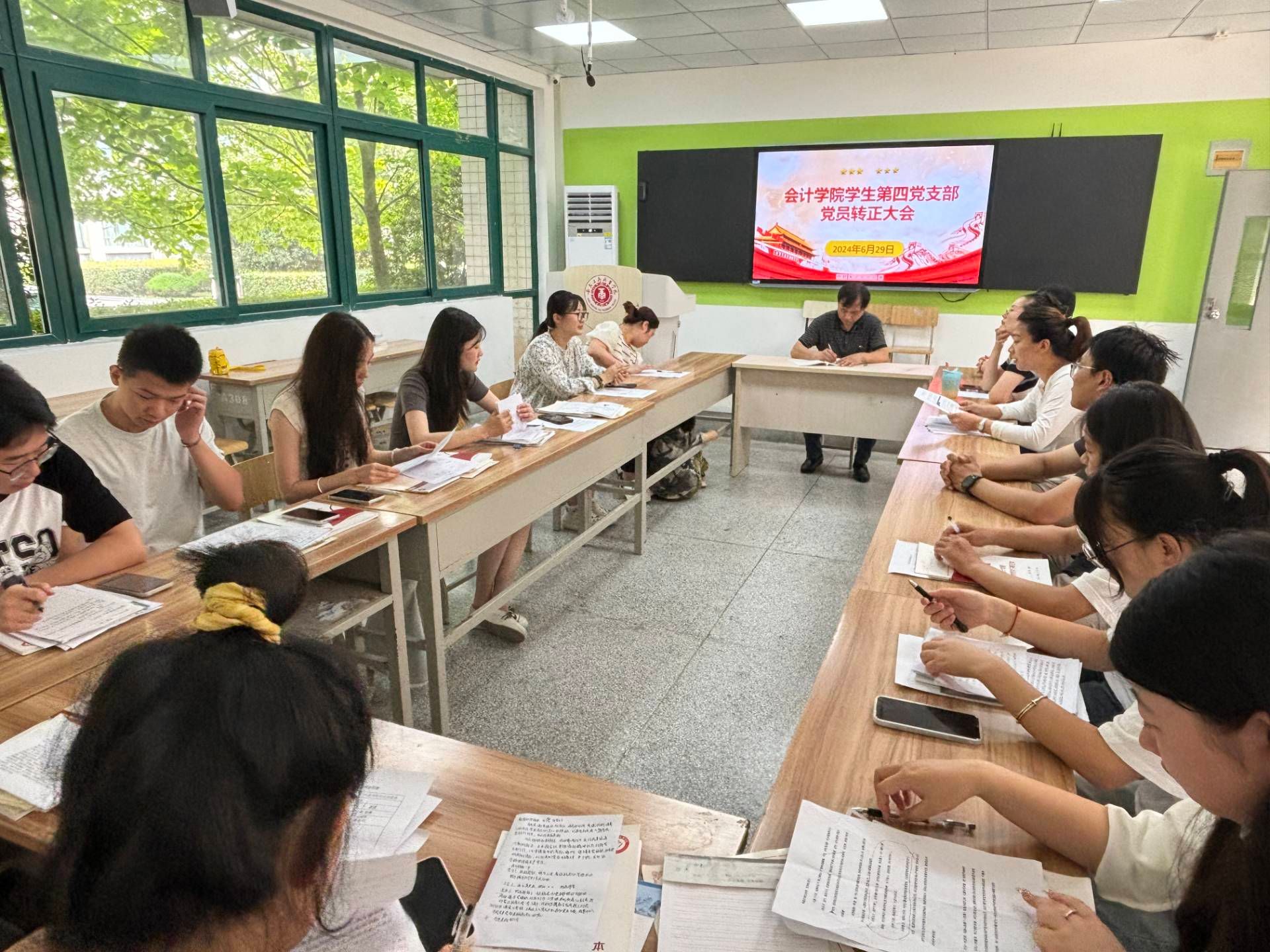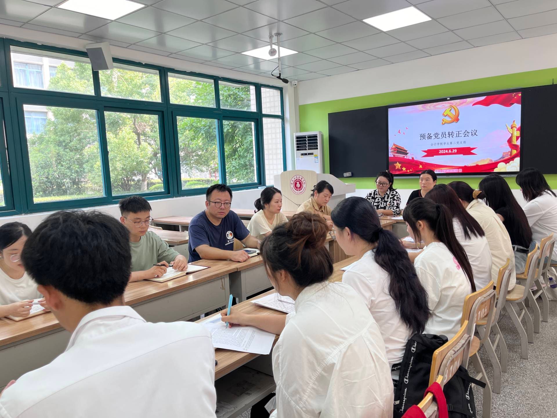 根据学校党委关于党员发展工作的整体部署,经过会计学院党总支的预审同意,我院学生党支部于6月29日在党建会议室及教学楼教室召开预备党员转正支部大会。此次大会主要审议王雨洁等41位同志由预备党员转为中共正式党员的事宜,旨在对他们预备期内的表现进行全面回顾与审查。