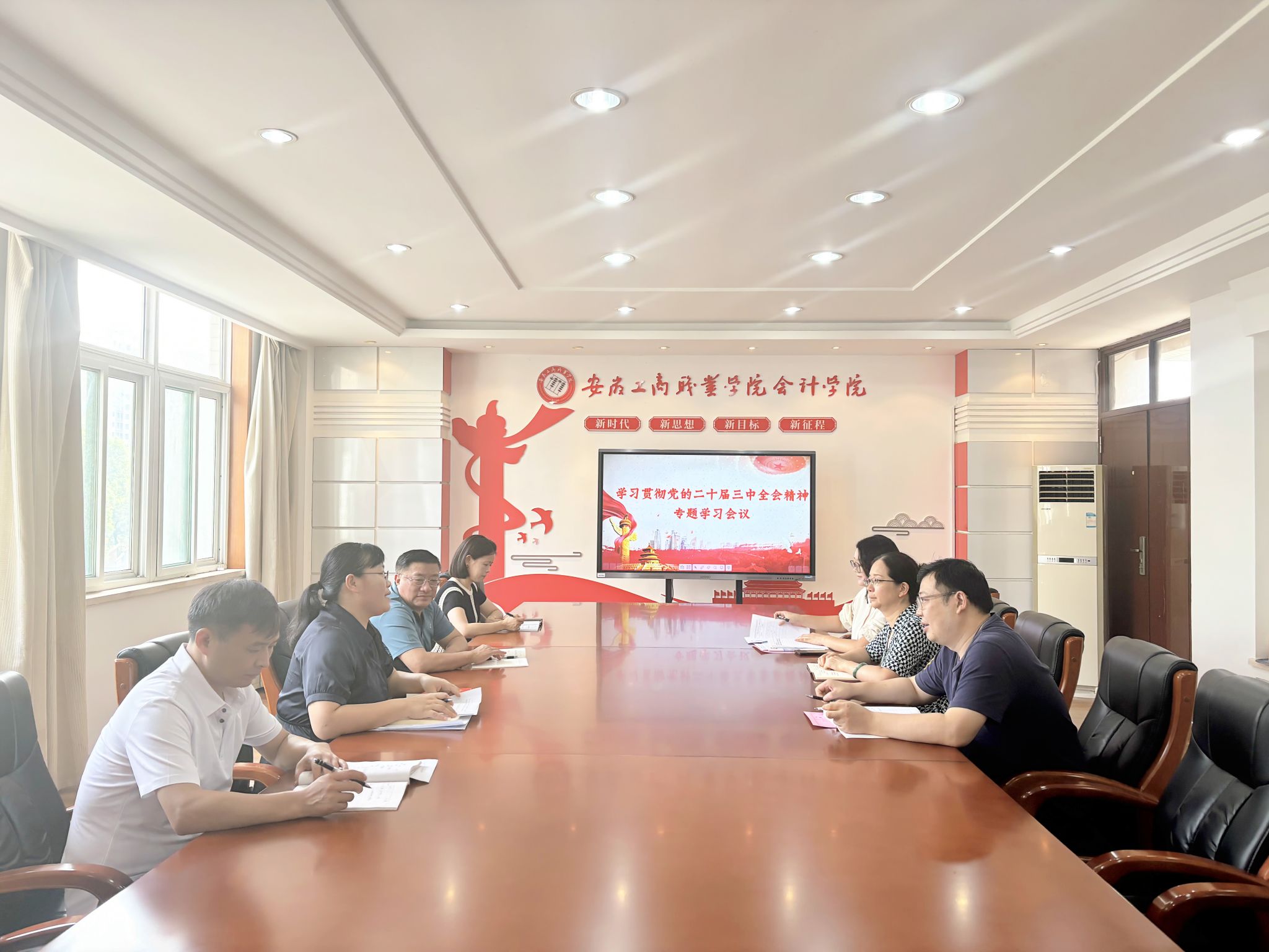 8月31日下午,会计学院二级理论学习中心组在明德楼二楼党建会议室召开学习会议,专题学习党的二十届三中全会精神。二级理论学习中心组成员参加学习,党总支书记赵艳同志主持理论学习会。